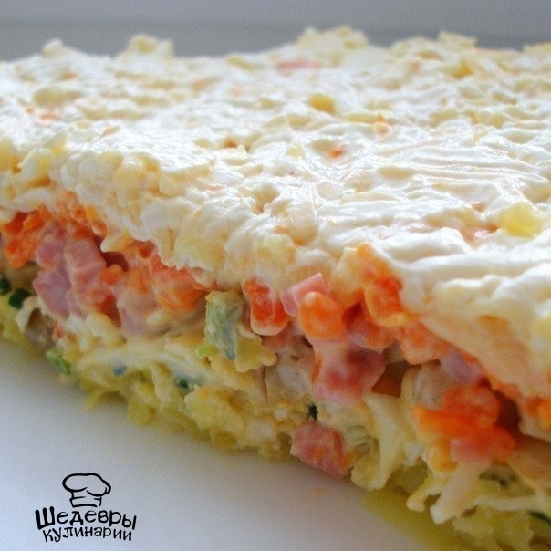 Все слои немного смазывать майонезом. Овощи подсолить.