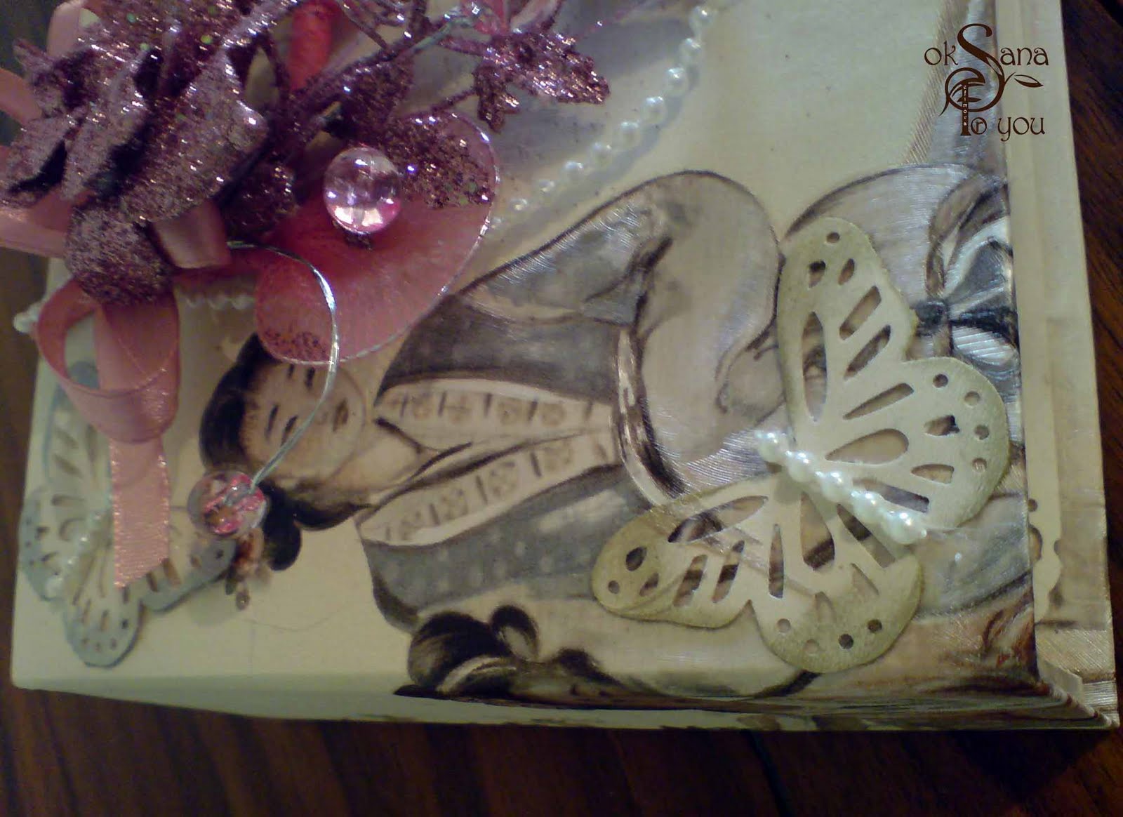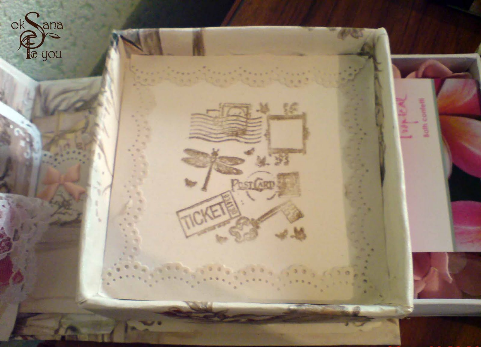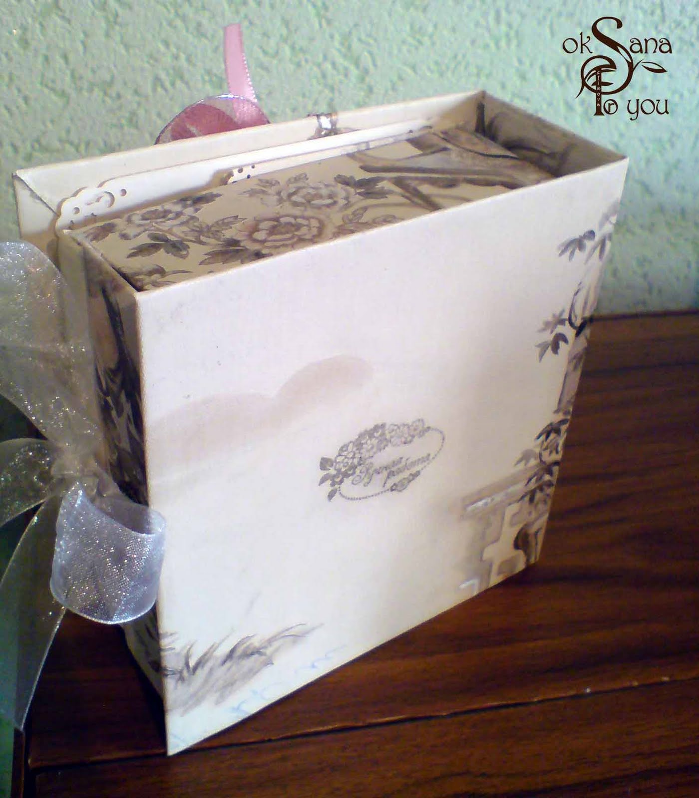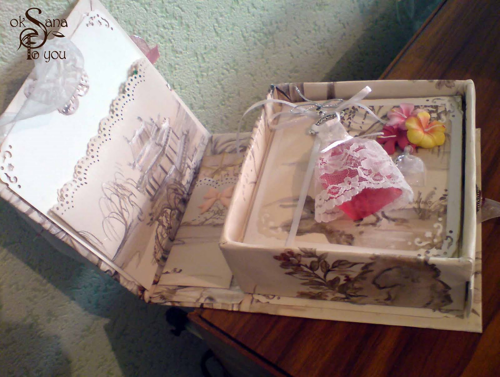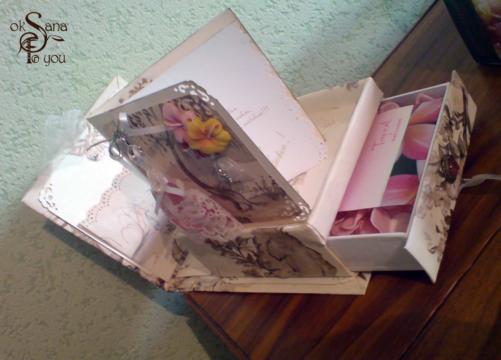 В верхней части - поздравительная открытка выполненная в том же стиле что и шкатулка