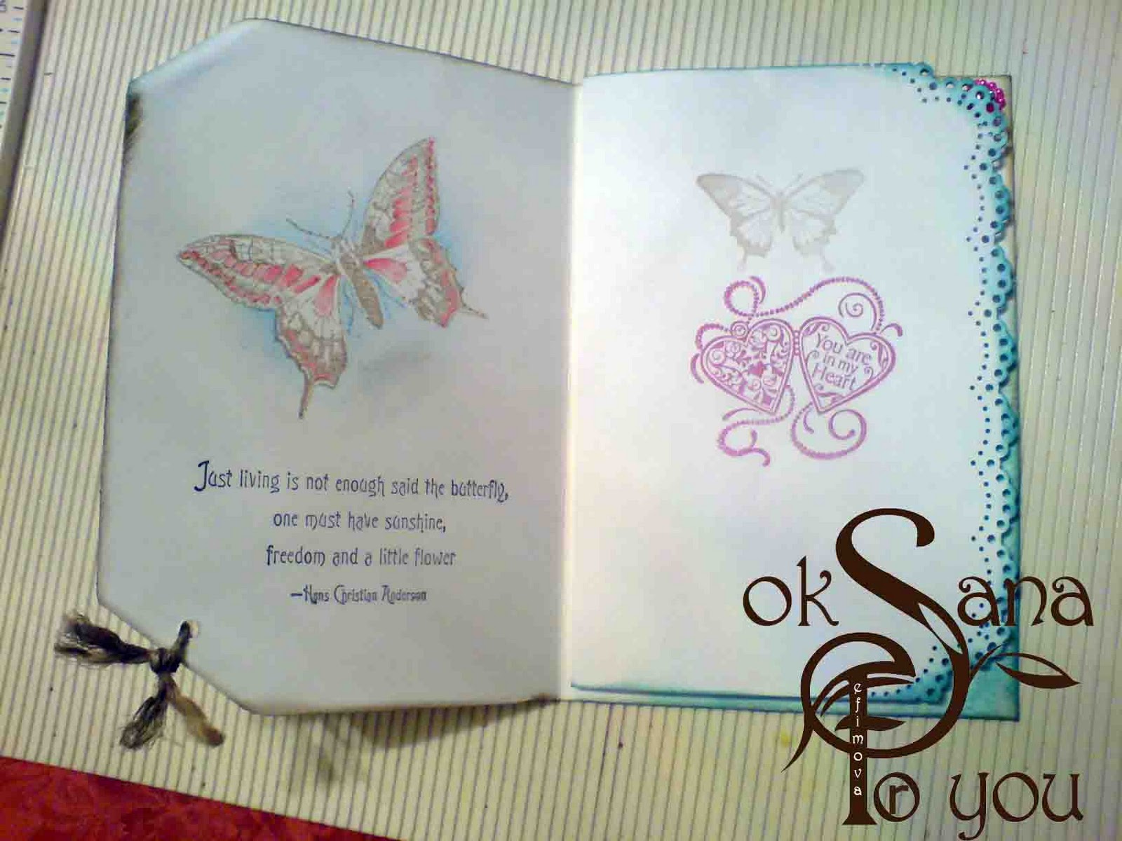 Вкладыш тоже со стихами - но они очень личные)))) Показать не могу по просьбе заказчика))) В прозрачное окошко кладётся денежка. Вся открытка выполнена с помощью моих любимых штампов с бабочками.