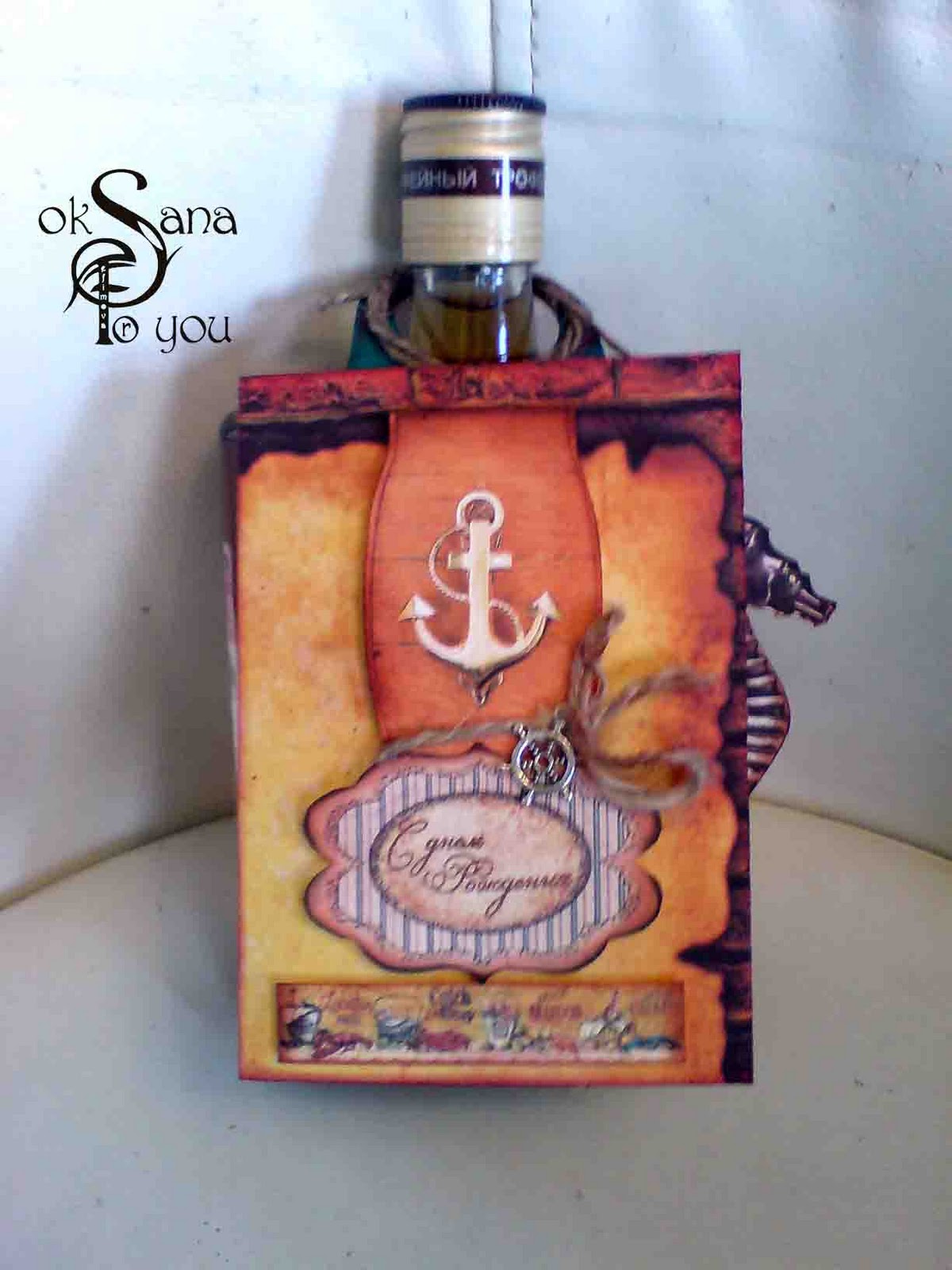 Вот такая открытка у меня сотворилась за 20 минут :) Стиль мужской, немного морской - хотелось передать образ таверны, ведь подарок - коньяк большой выдержки. Поэтому и открытка предполагалась подходящая к образу)))