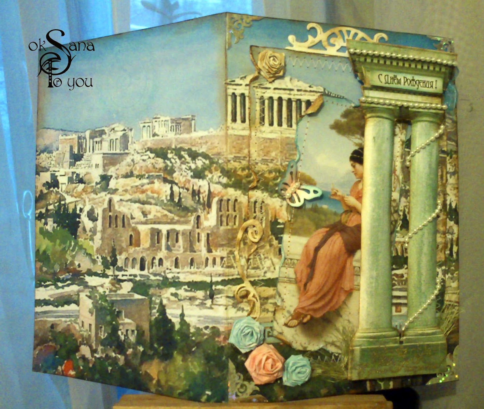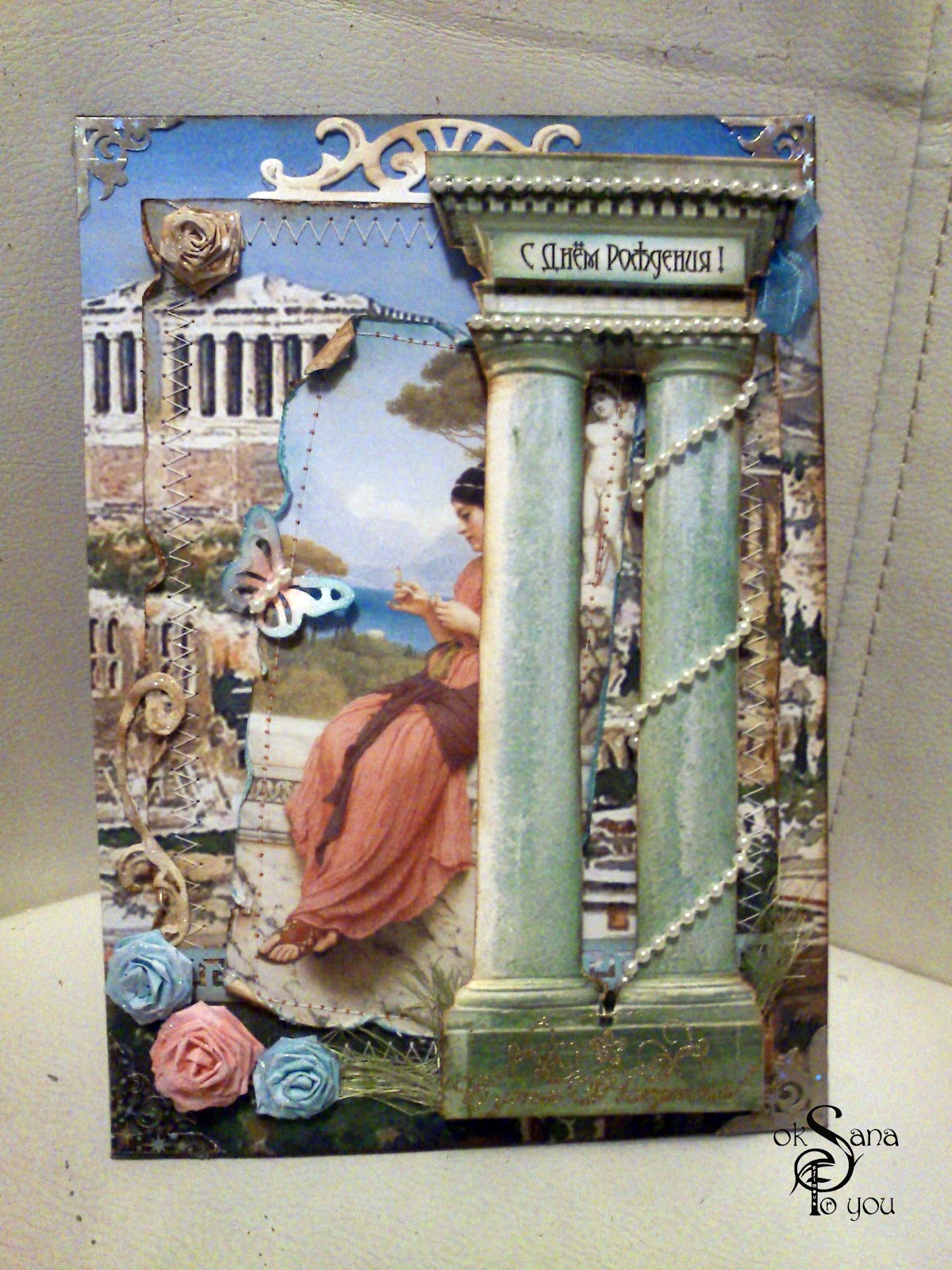 А вот открытка в греческом стиле - изюминкой стала машинная строчка, многослойные вставки с видами и колонны.
