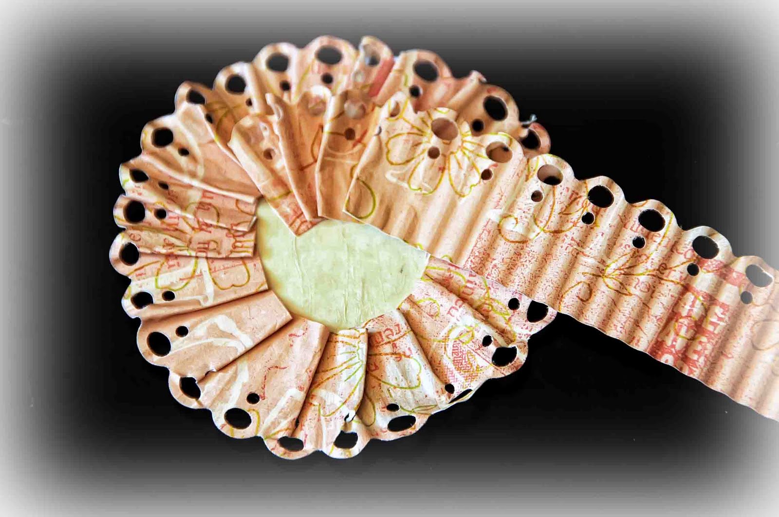 I did this flower tutorial back in January for Swirlydoos. I have had requests for it on my blog.OK...Since we couldnt go to CHA, and we missed out on all the fun of make n takes..I devised my own version just for us...I cant provide you with the materials, but I can provide you with instructions and a beautiful leaf pattern to down load The flower was inspired by Ilina Crouse who is a creative stamper, cardmaker and scrapbooker. I just added the leaves, which you could just use alone as an embellishment. I used them a lot in my February LO's. So here it is...What do you think!! I love my paper crimper!!