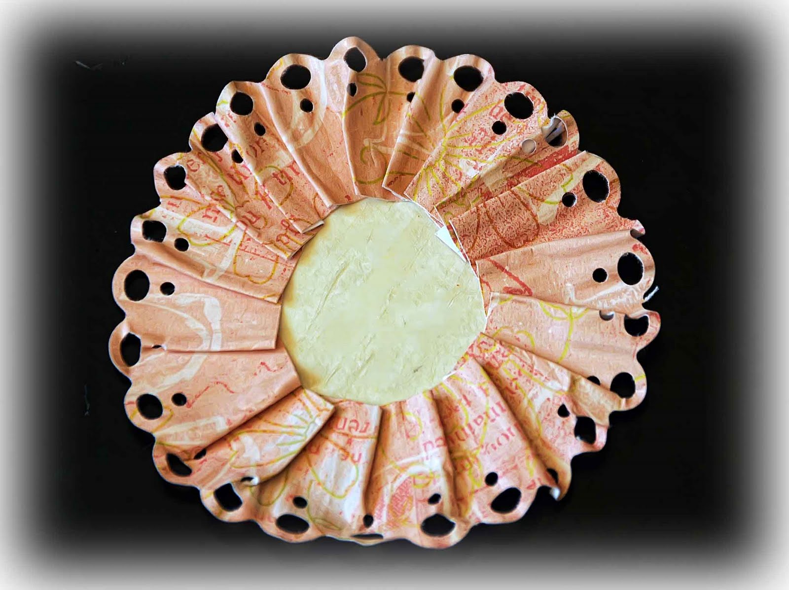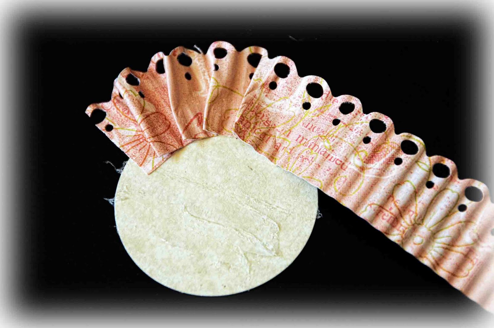 Starting with one end of the paper strip, start adhering the paper around the circle making little pleats along the way as you wind it around.