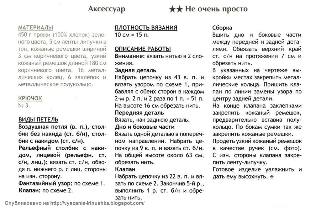 Воздушная петля (в. п.), столбик без накида (ст. б/н), столбик с накидом (ст. с/н). Рельефный столбик с накидом, лицевой (рельефн. ст. с/н, лиц.): вязать ст. с/н, обводя п. нижнего р. с лиц. стороны на изн. сторону. Фантазийный узор: по схеме 1. Клапан: по схеме 2.