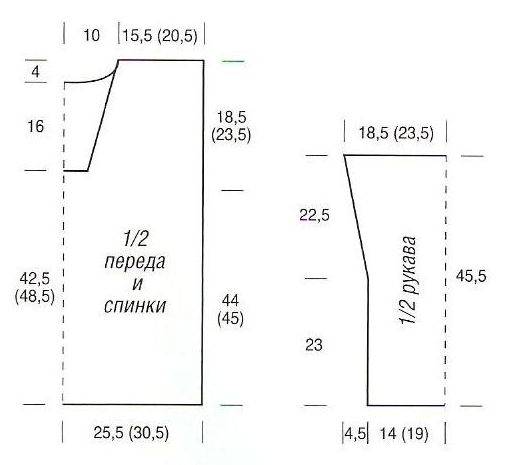 Узор для планки, круг. р., крючок № 3: число петель кратно 2. 1-й круг. р.: ст. б/н, при этом начать с 1 возд. п. вместо 1-го ст. б/н и закончить 1 соед. ст. в возд. п. начала. 2-й круг. р.: 1 возд. п., 1 ст. б/н, 1 пико (=3 возд. п., 1 ст. б/н в 1-ю возд. п.), * 2 ст. б/н, 1 пико, повторять от *, при этом не пропускать ст. б/н. предыдущего круг. р., закончить 1 соед. ст. в возд. п. начала. Повторить 1 раз 1-й и 2-й круг. р. Спинка: связать цепочку из 103 (123) возд. п. + 1 возд. п. подъема и вязать основным узором = 4 (5) раппортов + 11 начальных и 12 конечных п. Через 58,5 см = 41 р. (64,5 см = 45 р.) от наборного края оставить для выреза горловины средние 16 см и обе стороны закончить раздельно. Для закругления оставить с внутреннего края в каждом р. 2х1 см (общая ширина выреза горловины 20 см = 2 раппорта). Через 62,5 см = 44 р. (68,5 см = 48 р.) от наборного края связать на всех петлях для закрепления 1 завершающий р. следующим образом: в каждый ст. с/н 1 ст. б/н, в каждую арку 1 ст. б/н, между ними перейти к следующей арке с помощью 3 возд. п.; спинку закончить. Перед: вязать так же, но с более глубоким вырезом горловины. Для этого через 42,5 см = 30 р. (48,5 см = 34 р.) от наборного края оставить средние 10 см = 2х0,5 раппорта (1 раппорт) и обе стороны закончить раздельно. Для скоса выреза равномерно убавить с внутреннего края на протяжении следующих 12 р. еще 5 см (0,5 раппорта). Через 62,5 см = 44 р. (68,5 см = 48 р.) от наборного края связать только поверх петель плеч 1 завершающий р. как на спинке; перед закончить. Рукава: связать цепочку из 57 (77) возд. п. подъема и вязать основным узором, при этом начинать с петель от стрелки Ф, повторить 2 (3) раза раппорт, заканчивать петлями до стрелки В. Через 23 см = 16 р. от наборного края прибавить для скосов рукава с обеих сторон 1 ст. с/н, в каждом 2-м р. 3х1 ст. с/н, затем прибавить в каждом 2-м р. между 2-м и 3-м ст с/н 1х1 возд. п., между 1-м и 2-м ст. с/н 1х1 возд. п., после этого прибавить с внешней стороны 1 ст. с/н, затем между 1-м и 2-м ст. с/н 1х1 возд. п. и с внешней стороны еще 1х1 ст. с/н = 9 прибавленных п. Через 45,5 см = 32 р. от наборного края связать 1 завершающий р. как на спинке; рукав закончить. Сборка: выполнить плечевые швы; втачать рукава, выполнить боковые швы и швы рукавов. Обвязать вырез горловины, нижний край и края рукавов 2 круг. р. узора планок. [показать] |