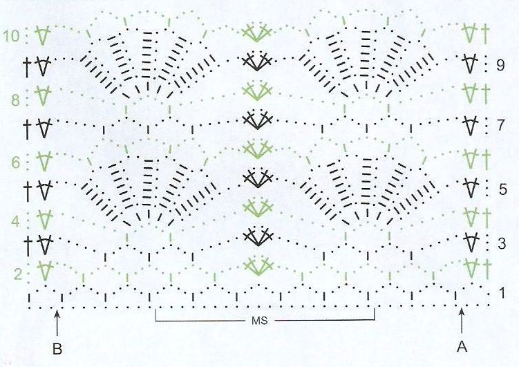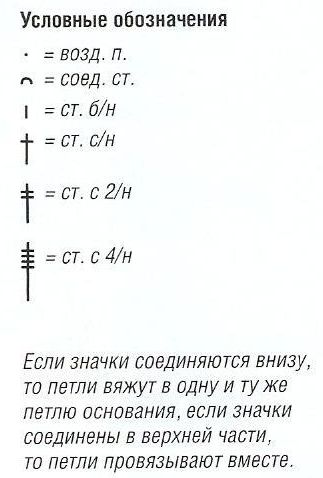 Внимание! В 5-м и 9-м р., после выполнения каждых 8 возд. п. и 1 ст. б/н в арку предыдущего р., повернуть работу для вееров, затем связать в эти возд. п. ст. б/н, повернуть и после этого вязать , как обозначено.