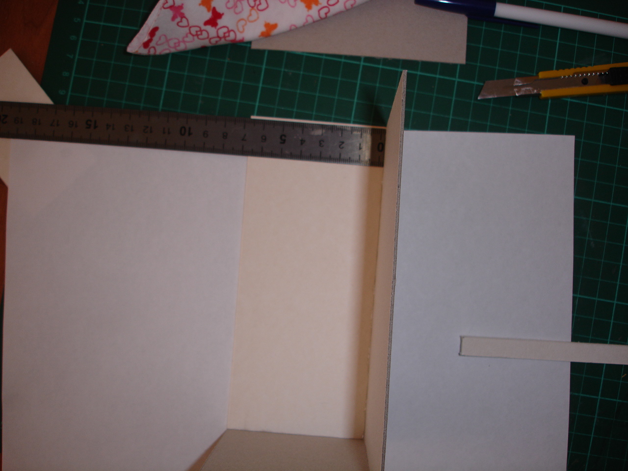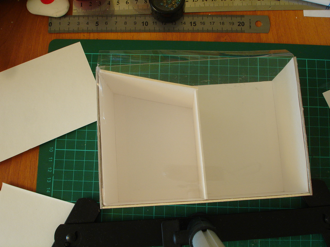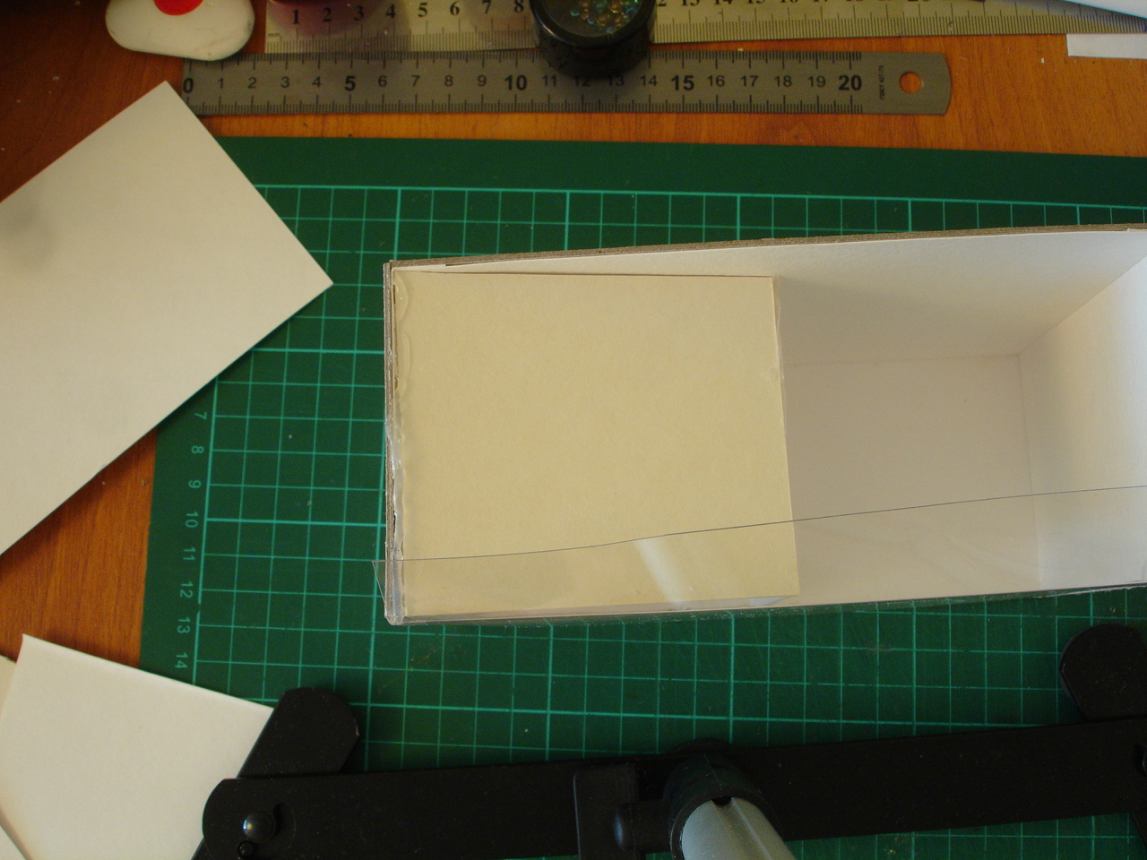 Теперь из картона 1,5-2 мм вырезаем перегородку и ее тоже обклеиваем бумагой для черчения. Я из белой бумаги вырезала полосу нужной высоты и, приклеивая, обернула перегородку. Так получается более аккуратно. Потом перегородку вставляем внутрь коробочки так, чтобы сгиб "обертки" был на лицевой части копилочки.