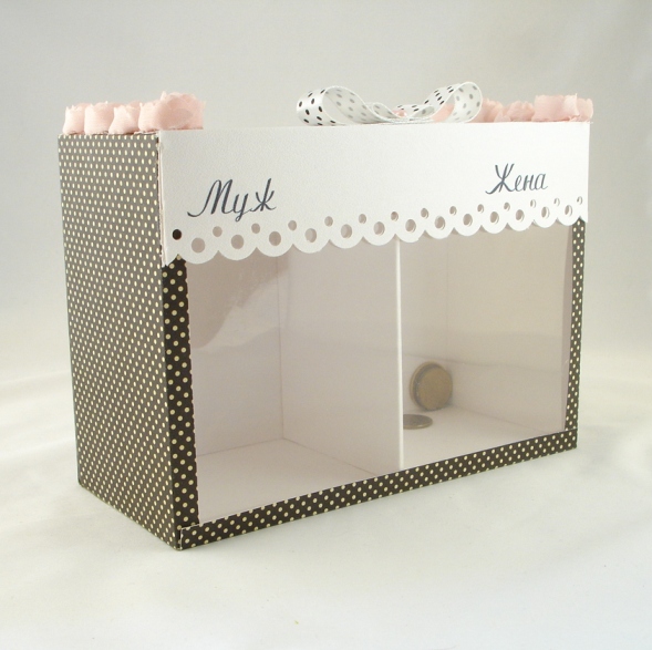 Приклеиваем верхнюю часть, обклеиваем нашу копилочку скрап-бумагой и декорируем. Угол наклона верхней перегородки надо сделать так, чтобы в копилочку помещались без проблем пять рублей.