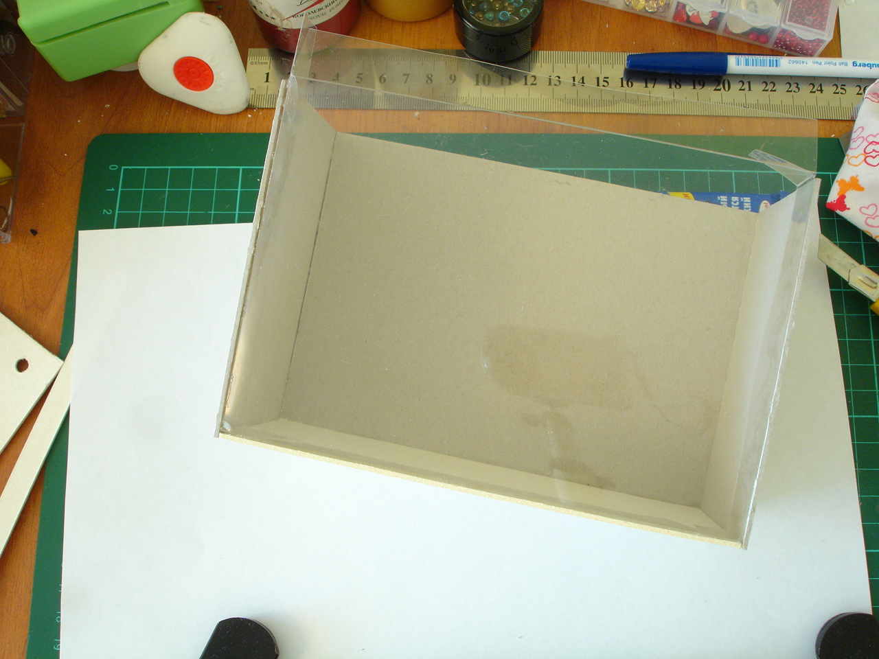 Из плотной прозрачной пленки вырезаем лицевую часть нашей копилочки... у меня была акриловая коробка... Вставляем ее в нашу заготовку и приклеиваем.
