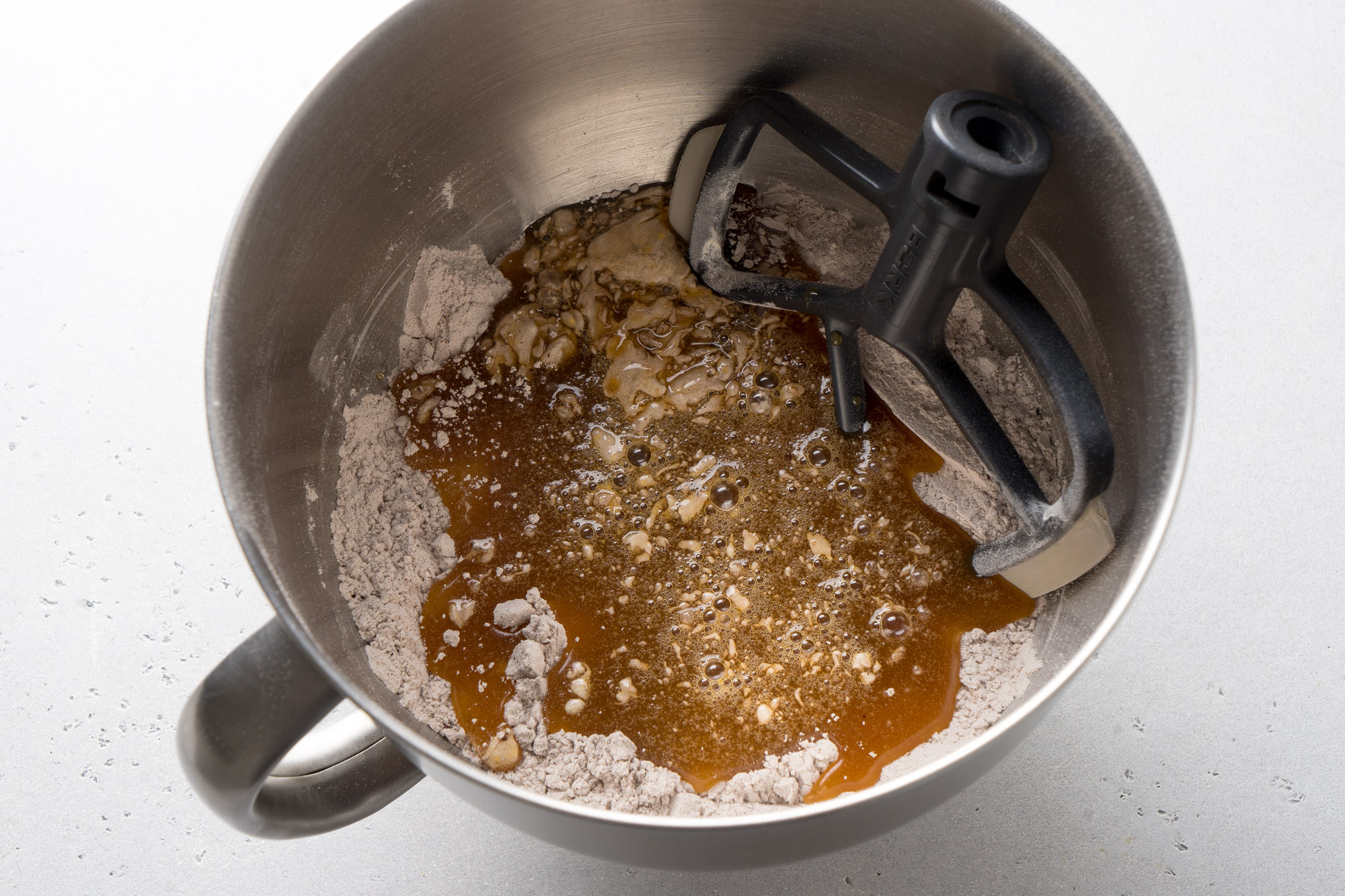 Влейте в мучную смесь и объедините до получения пластичной массы.