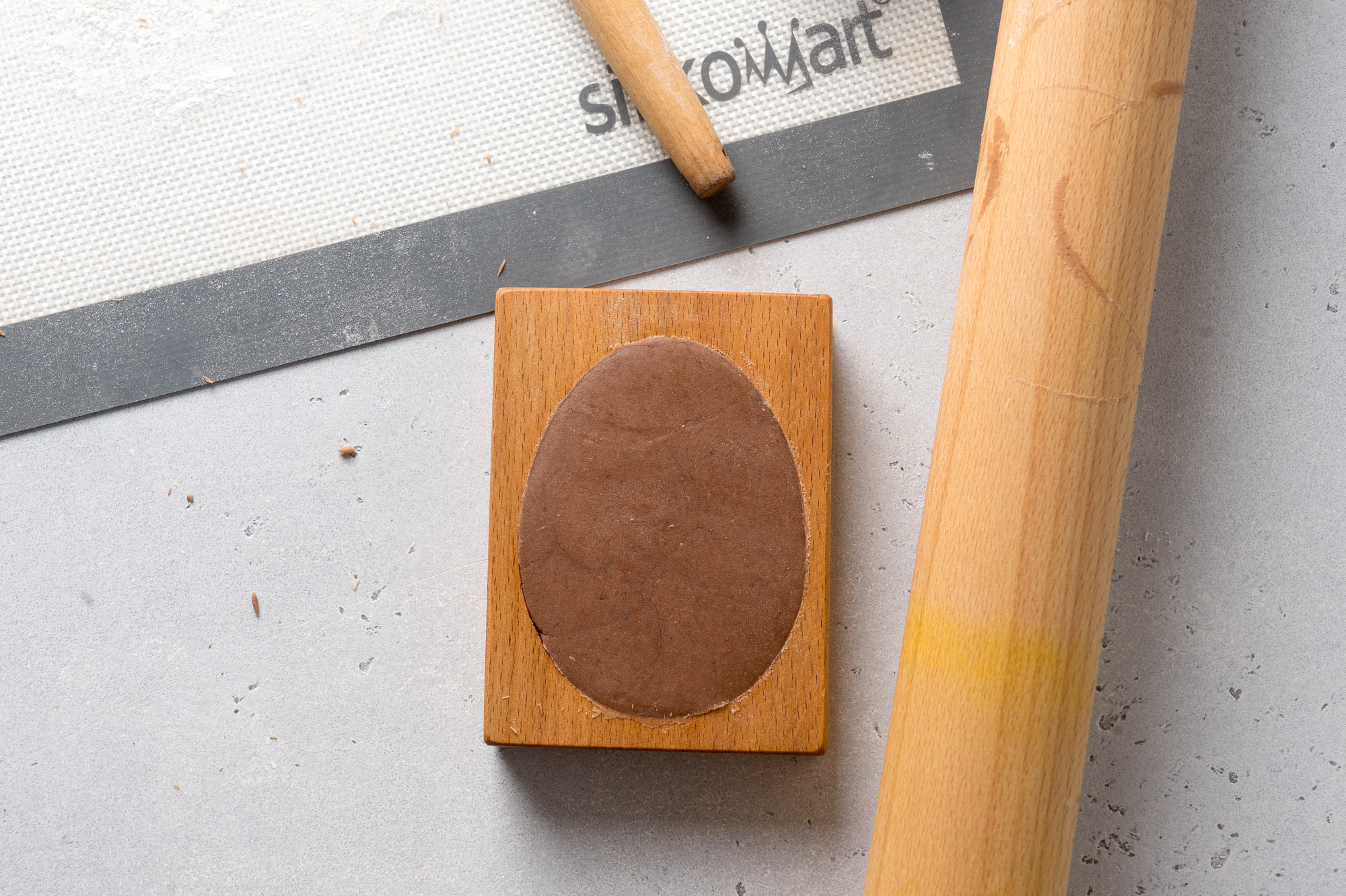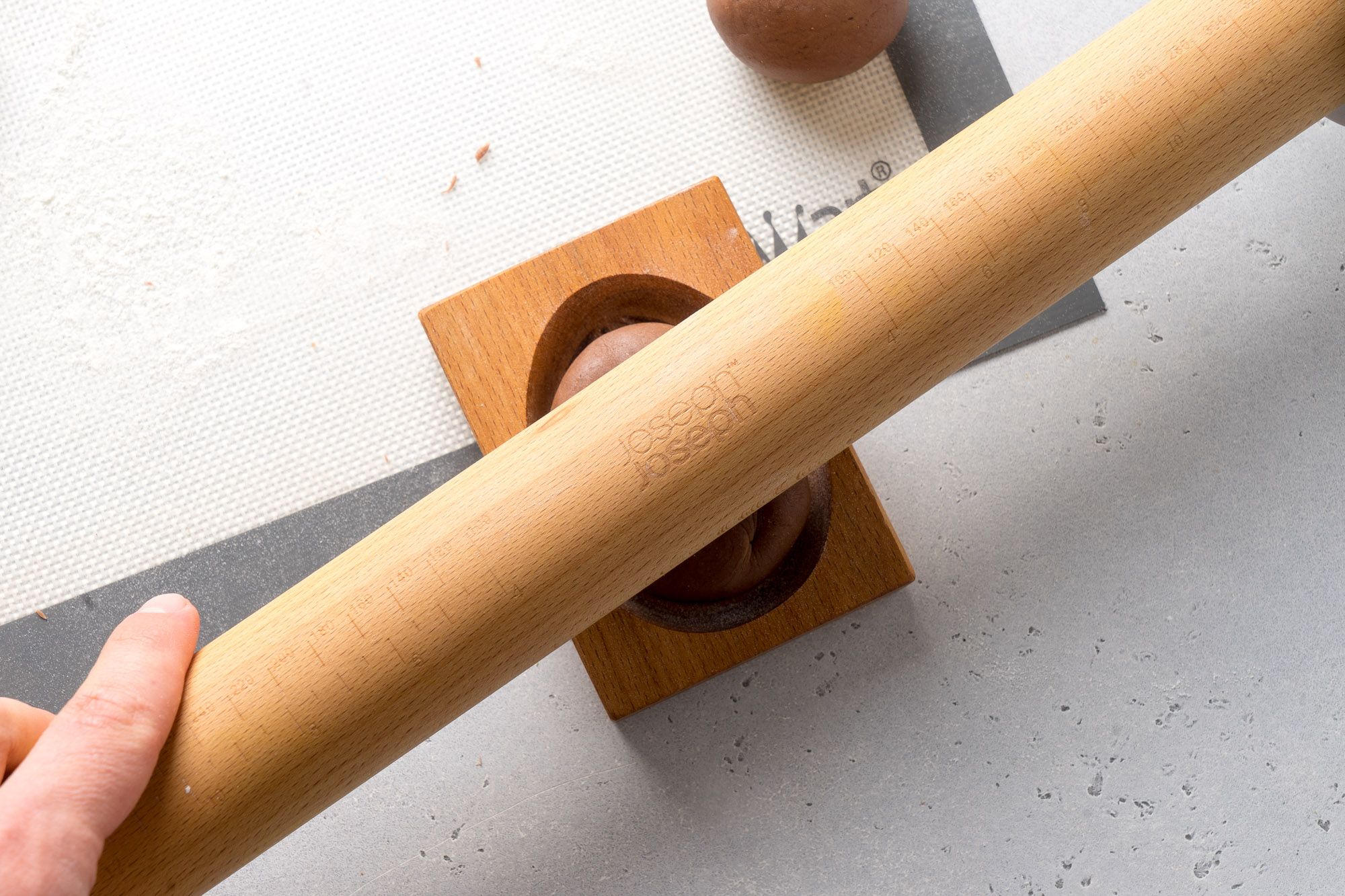 скалкой проходим по форме, как бы впечатывая тесто. Таким образом у нас получится хороший рельеф.