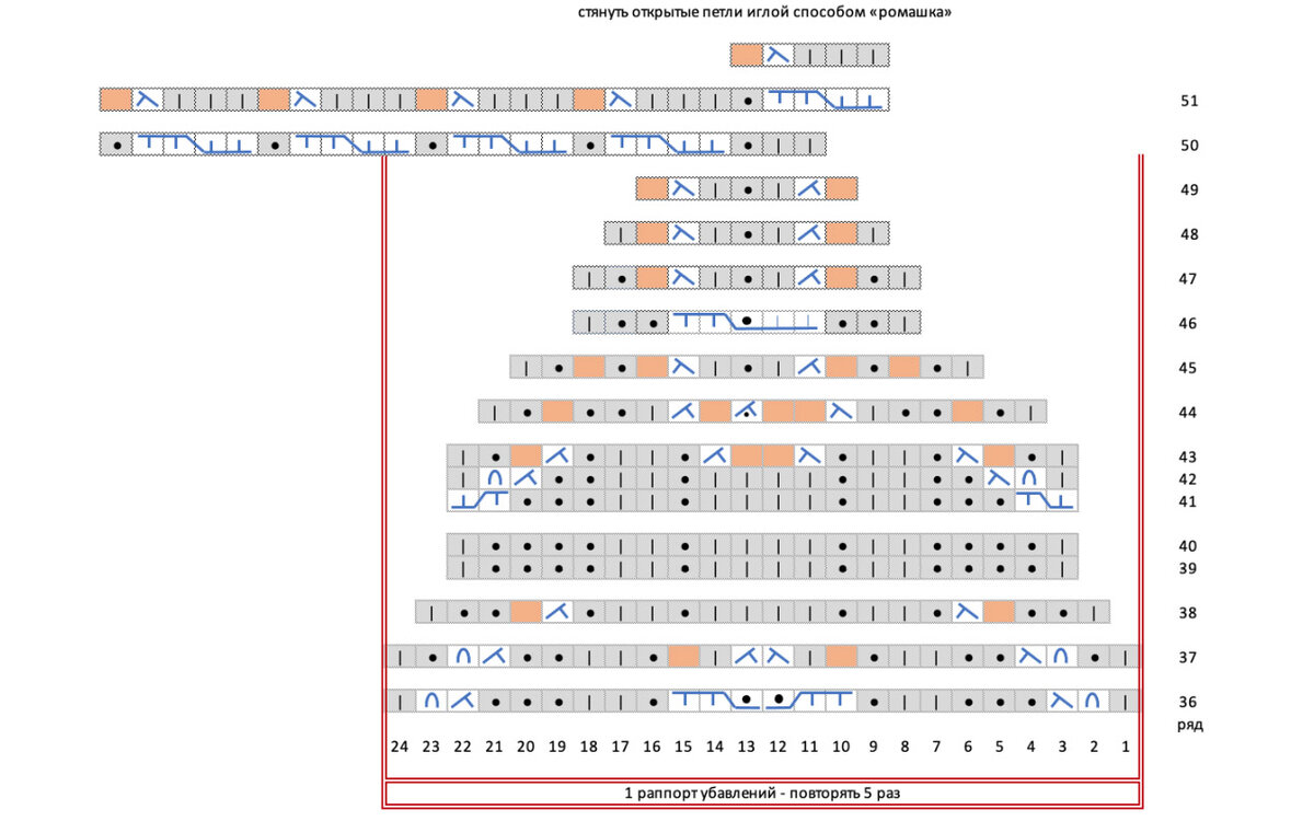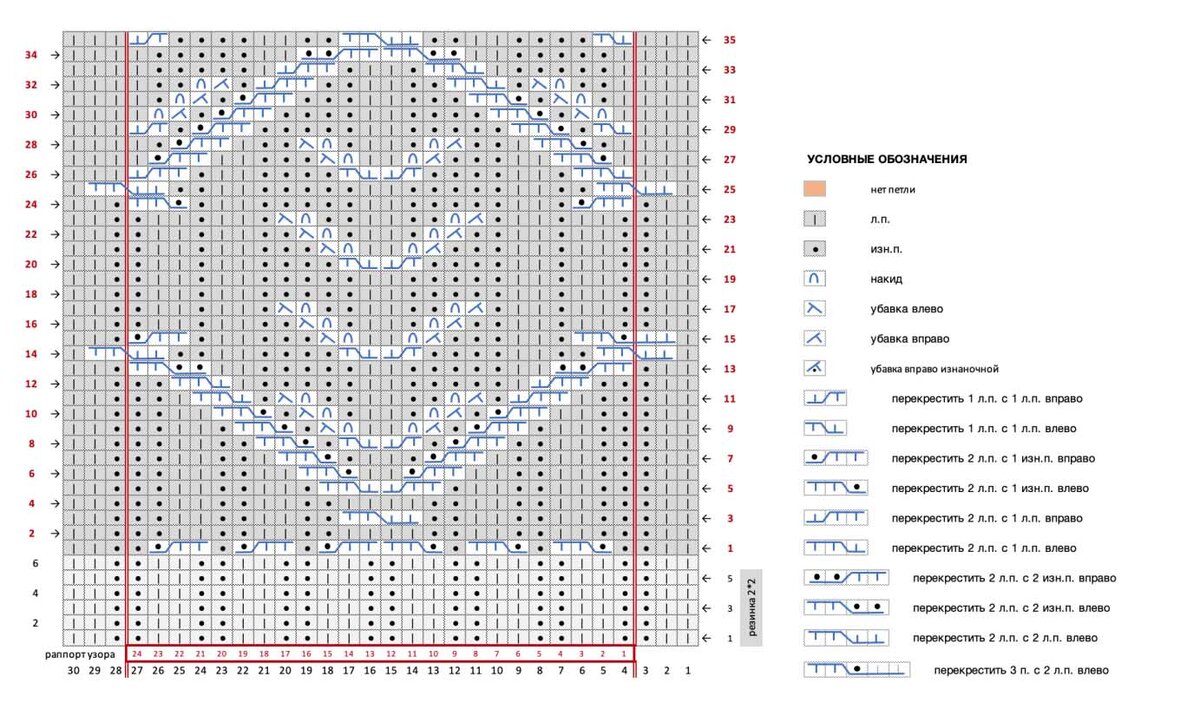 Перед началом вязания свяжите образец! Для образца наберите 30 петель, провяжите в высоту 41 ряд согласно схеме. Раппорт узора обозначен красной рамкой. Закройте петли любым способом и проведите ВТО.