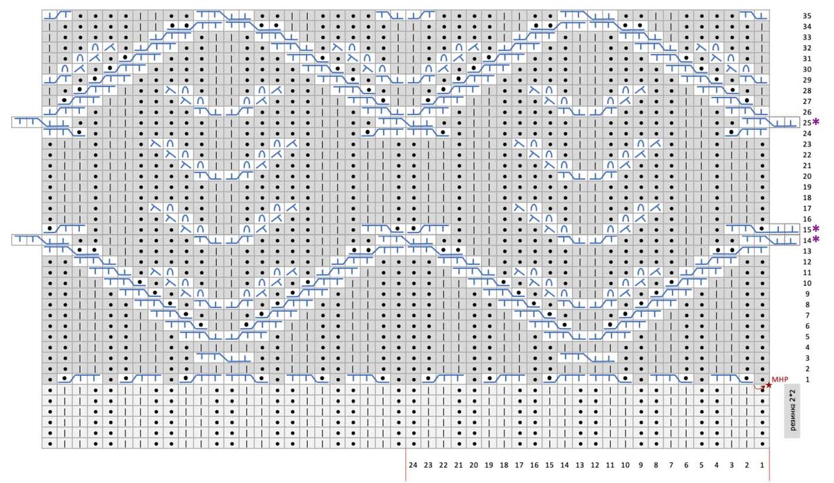 Приступаем к вывязыванию узора на спицах 4,5мм. Вяжем узор по схеме с 1 по 35 ряд. У вас получится 5 раппортов (по 24 п.) в ширину: