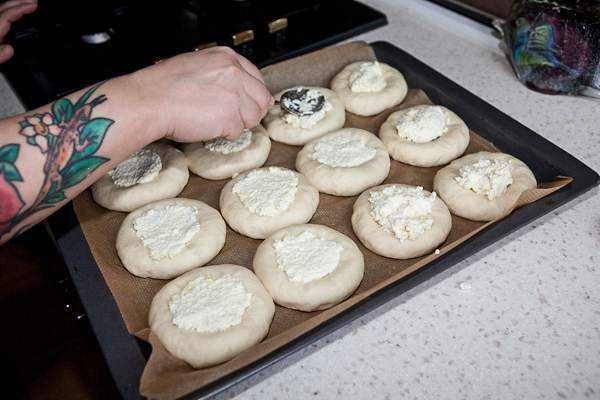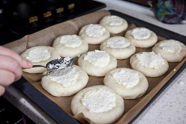 В каждое углубление выложите по полной столовой ложке творожной начинки.