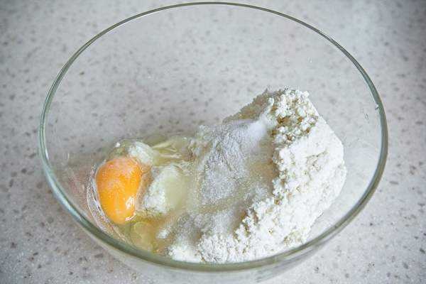Творог выложите в небольшую миску. Добавьте к творогу 2 столовые ложки сахара, щепотку ванилина и одно сырое яйцо.