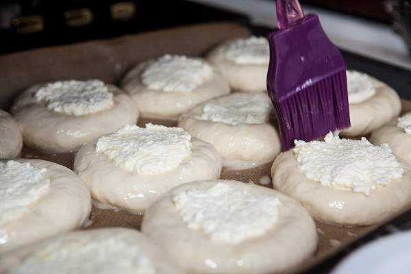 Аккуратно кисточкой смажьте размешанным яйцом ватрушки со всех сторон.