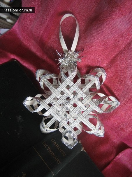 Из последней полоски сделаем петельку и приклеиваем к одному из уголков снежинки. Украшаем снежинку мишурой. Готово:)