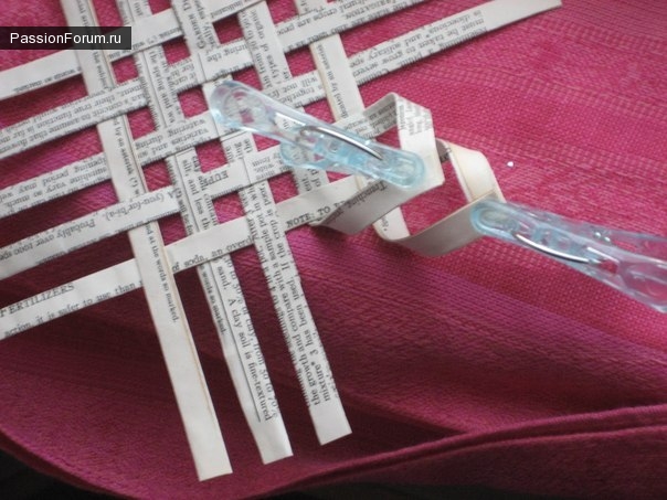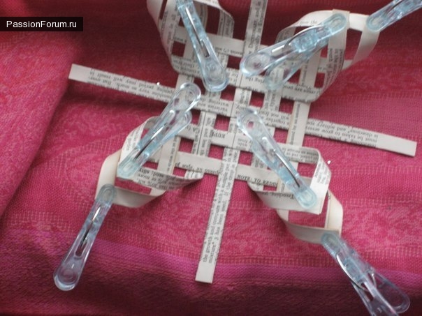 Берем две крайних полоски (например, в нижнем правом углу), склеим их попарно и закрепляем ненадолго место склеивания прищепками.