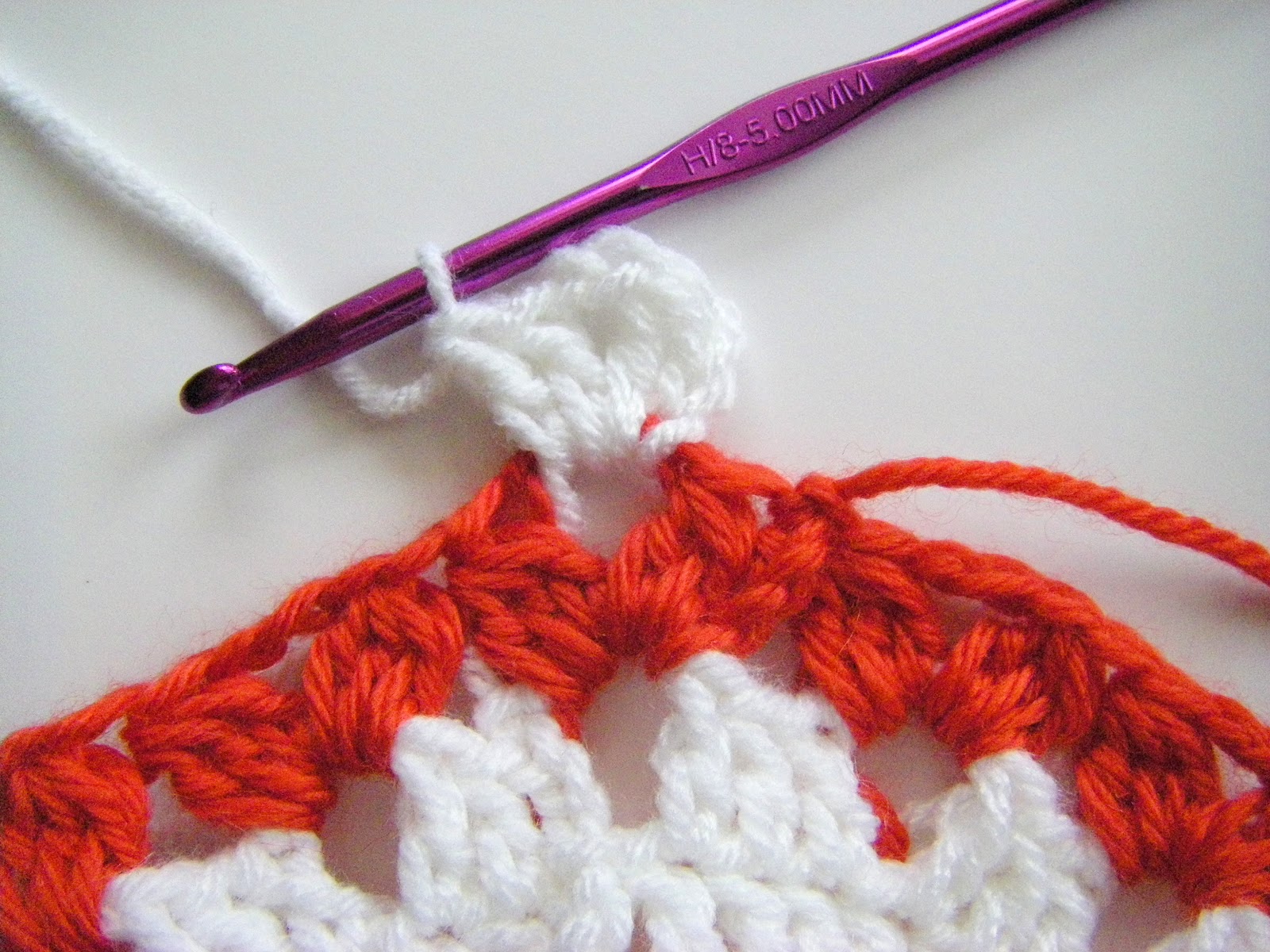 Rnd 8--- Join new color. Ch 4 (counts as 1st tr), 5 tr in ch 2 space