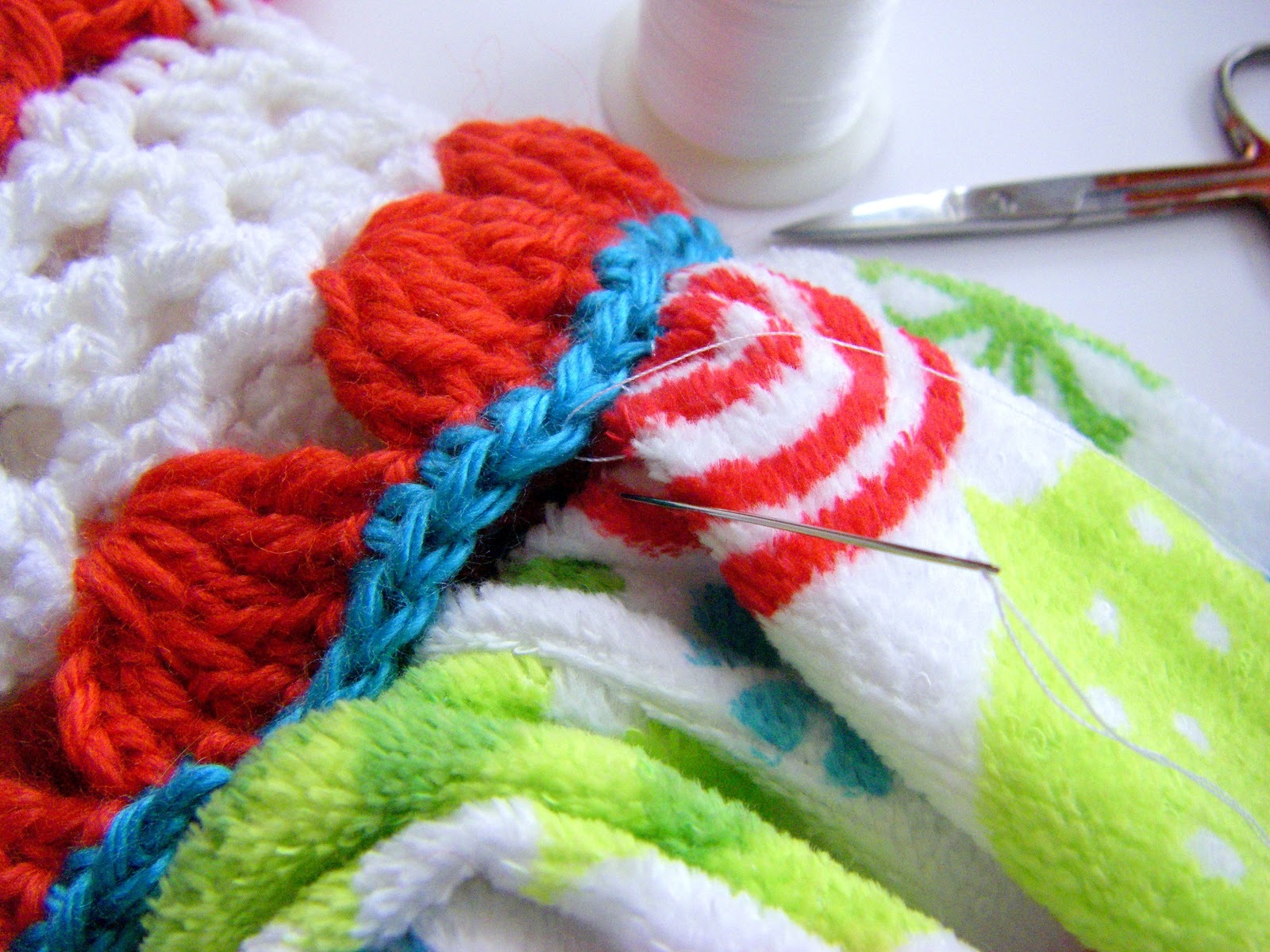 I'm not sure if there is method to attaching this to a towel, but I do know that I don't like it when the towel is cut in half. So I used the entire towel and just hand-sewed a gathering stitch right along the center of the towel to create a rouching effect.