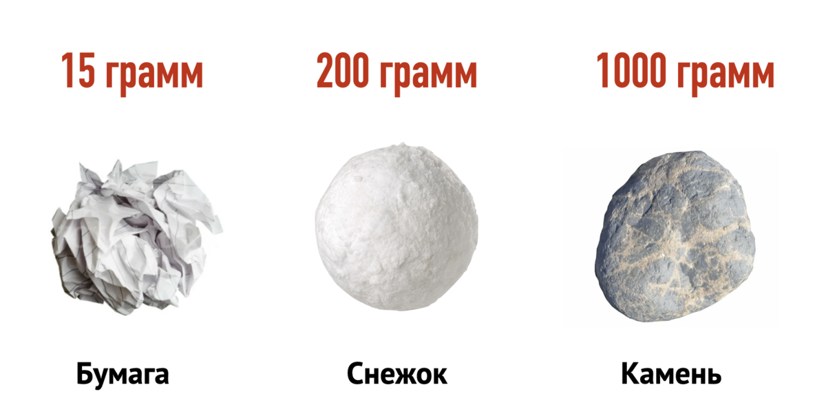 Очевидно, что бумага очень лёгкая, и потому она не несёт много энергии. Снежок – потяжелее и потому энергии в нём больше. Камень же самый тяжёлый из всех, и потому его энергия максимальна (при равной скорости полёта).
