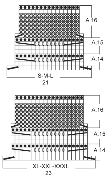 Выполнить диаграмму A.1: 1 кром. п платоч. вязкой, 13-15-16-18-19-22 раппортов A.1 (= 21 п) до последней п, 1 п платоч. вязкой. Кромочные петли и далее вязать платоч. вязкой до конца изделия. После A.1, 223-257-274-308-325-376 п в работе.