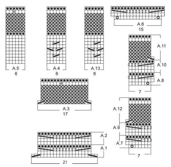 = 106-116-129-144-157-176 п. После 5-5-6-5-5-6 вертикальных выполнений A.2, вязать узор по диаграмме A.3 над A.2 Выполнить диаграмму A.3 1 раз вертикально. = 94-104-115-128-139-156 п в работе.