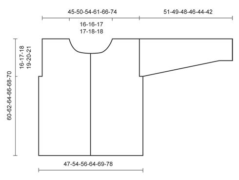 На высоте изделия 22 см прибавить по 1 п с обеих сторон меток (см. описание выше), = 4 прибавления/ряд. Повторить прибавления через кажд. 2.5 см всего 4 раза = 164-180-196-216-240-264 п. На высоте изделия 33-33-34-34-34-34 см перейти на круг. спицы 3 мм. Выполнить 1 вертикальный раппорт по диаграмме A.1 и затем свободно закрыть все петли. Длина топа составляет ок. 52-54-56-58-60-62 см.