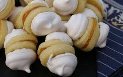 3. Возьмите тесто из холодильника и раскатайте его в пласт толщиной 4-5 мм и вырежьте печенья небольшой круглой формы. Поместите их на лист, покрытой пергаментной бумагой. Кондитерский мешок заполните безе и выдавите на печенье, придавая красивую форму.
