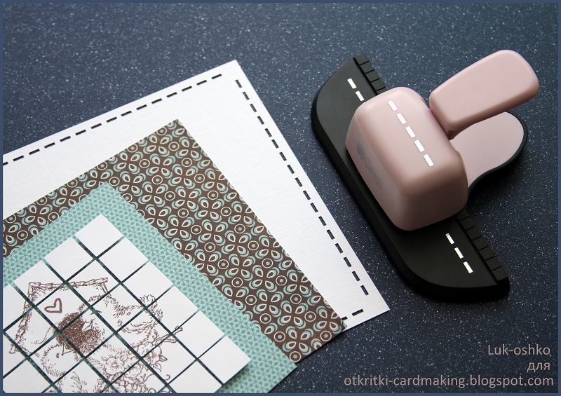 Если у вас нет фигурного дырокола типа квадратика или прямоугольника с волнистым краем, можно обойтись только ножницами. В этом случае всё предельно ясно: расчерчиваем рисунок и нарезаем его. Я же покажу, как действовать, если дырокол есть.