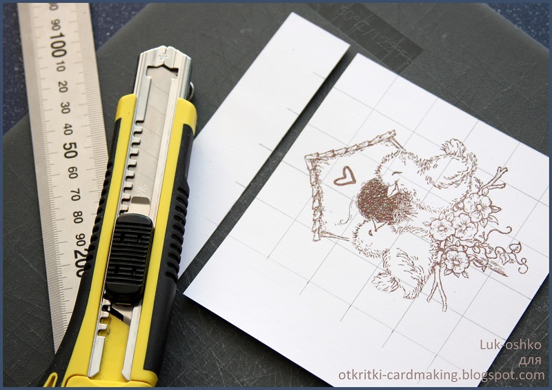 Итак, предстоит немного расчетов. Измеряем фигурку имеющегося компостера. Мой квадратик равен 1,8см. Я делаю припуск в 1мм и получаю «постоянную» 1,9см. Теперь прикидываю, сколько квадратиков понадобится на рисунок. Для этого измеряю оттиск, не забывая о свободном пространстве вокруг него и делая прибавку в 5-10мм по сторонам. Получилось примерно 9см на 10,5см.