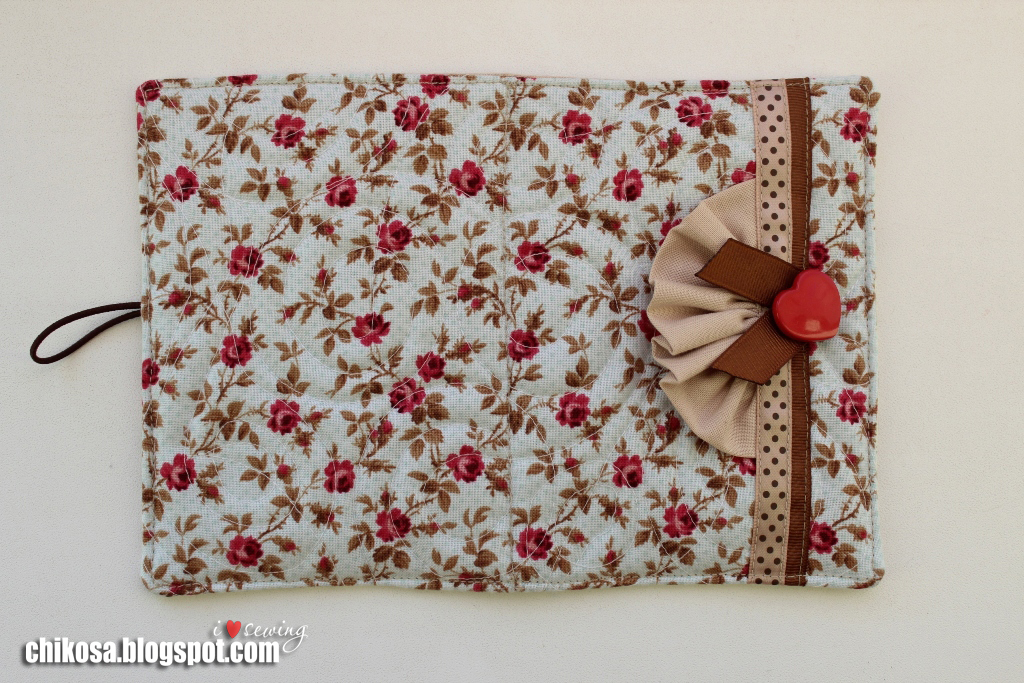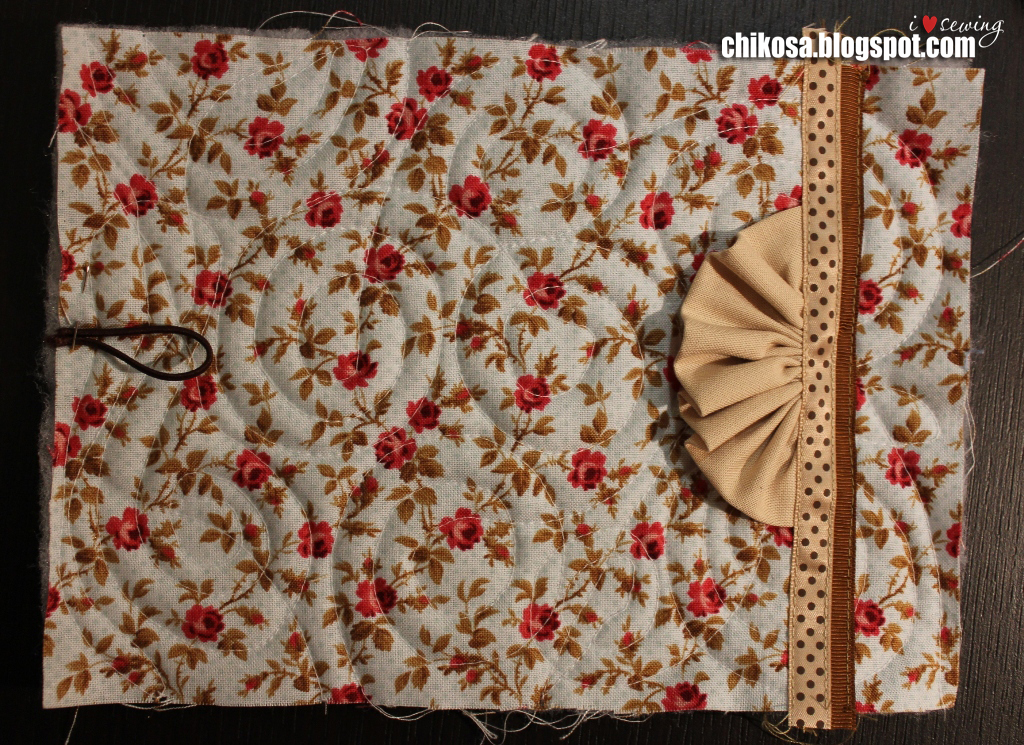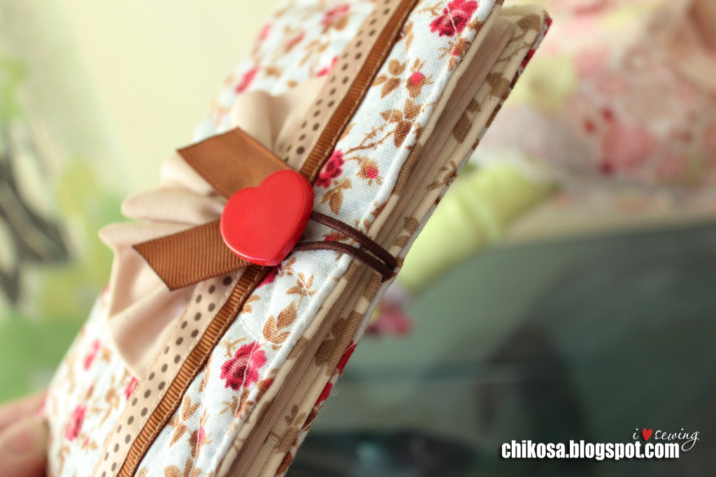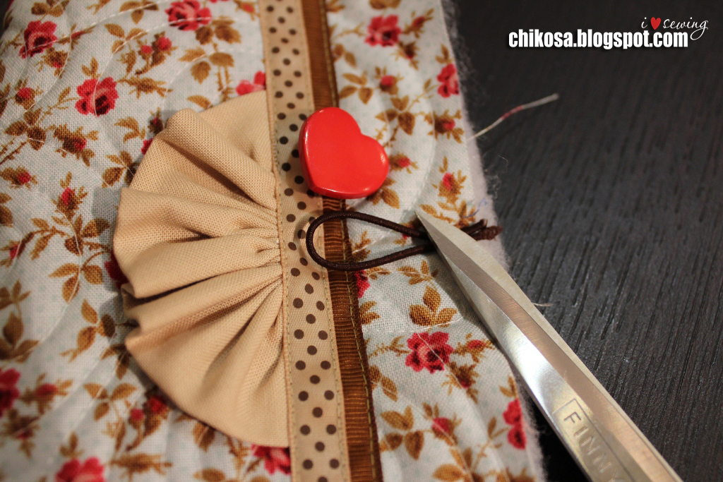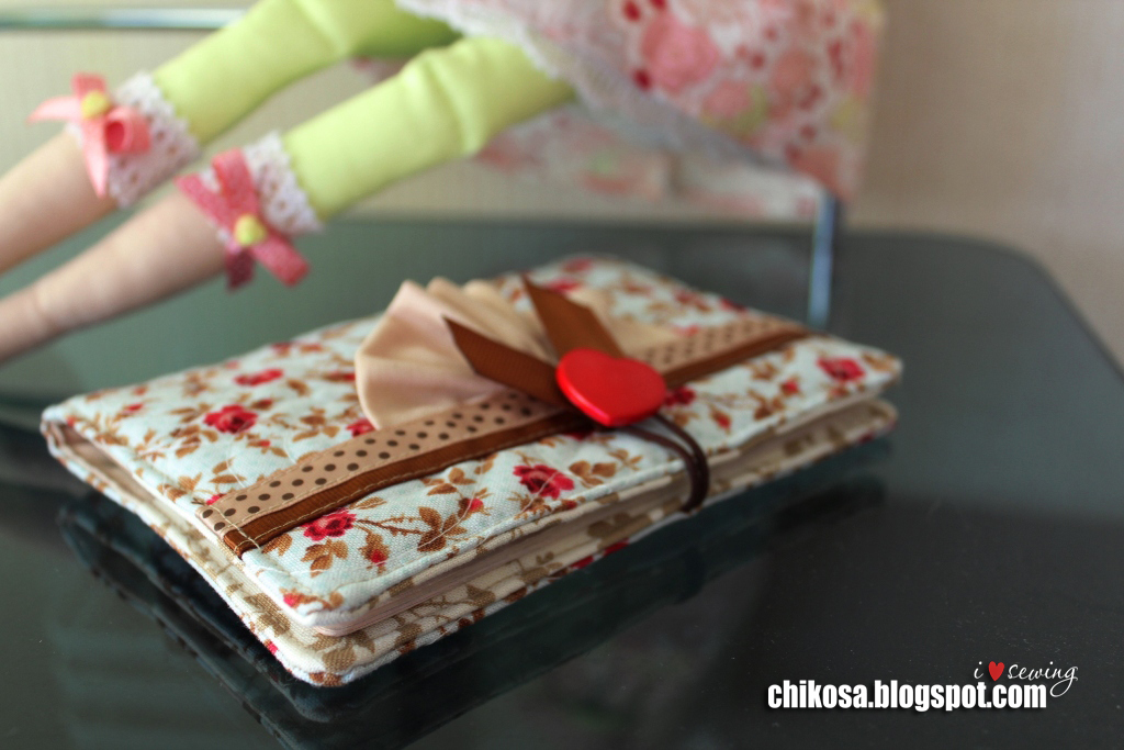 Дошив строчку до противоположной стороны, шьем обложку по контуру как можно ближе к краю (1,5-2 мм от края). Дойдя до начала, отрежем нить, оставив длинной и не делая закрепки. Чтобы аккуратно смотрелось, в обеих точках вдеваем по две нити в иглу и на месте прошиваем закрепку, спрятав нити внутрь. Пришиваем пуговицу и кусочек ленты для декора (я оплавляю срезы зажигалкой).