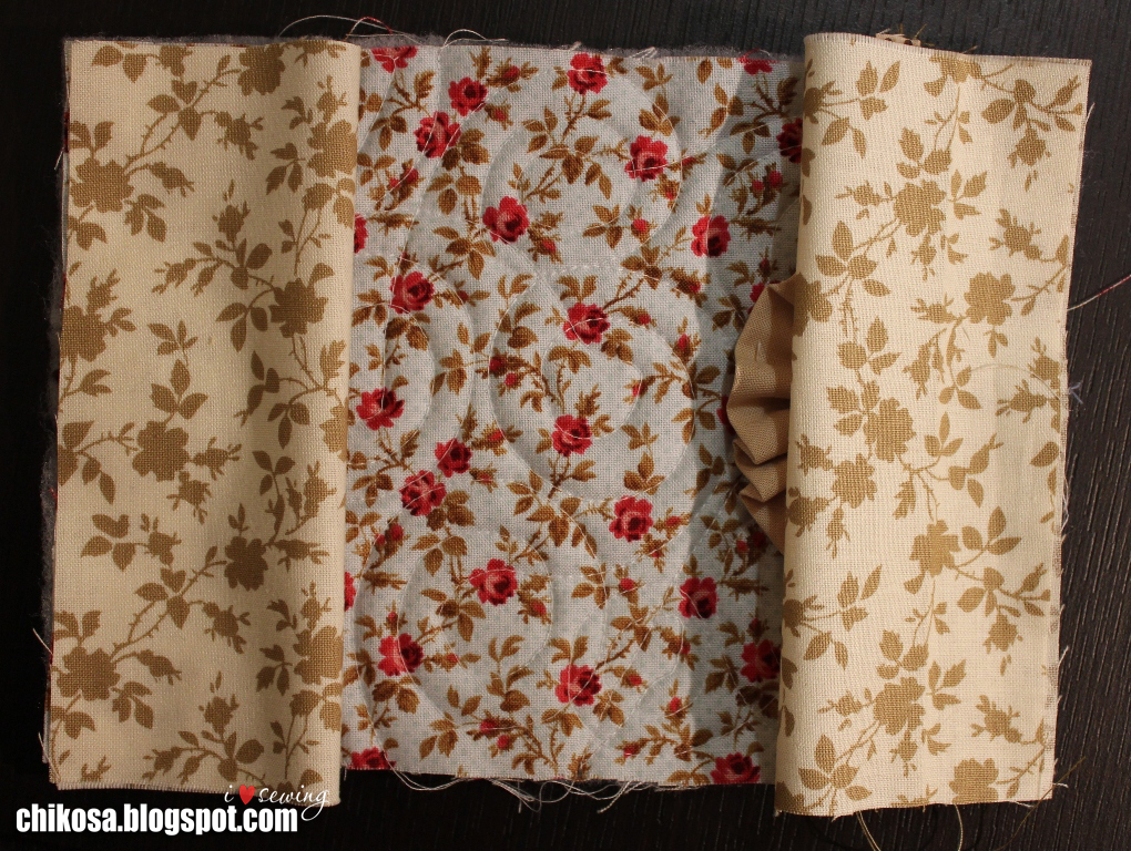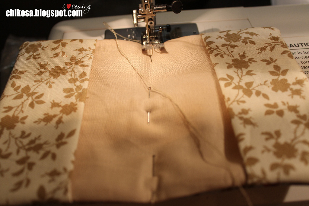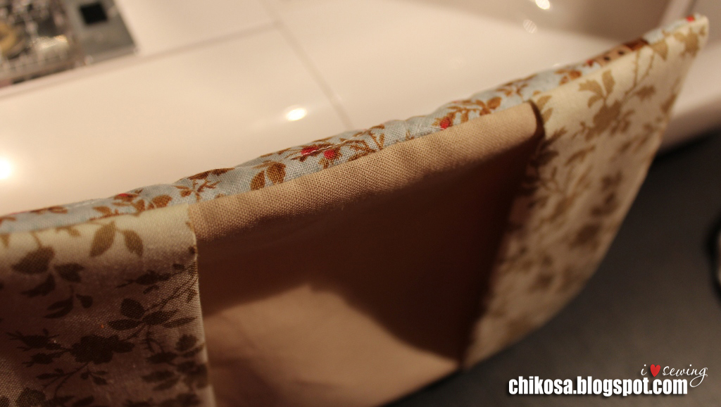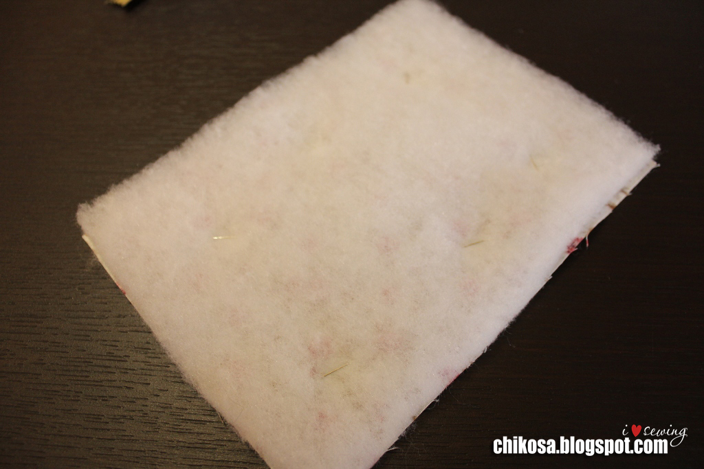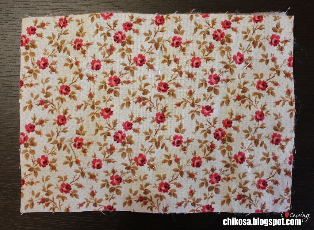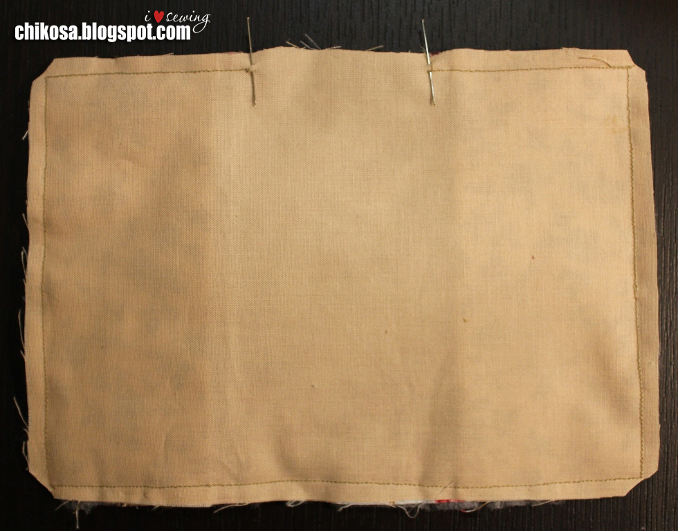 Сверху подклад лицом вниз. Все слои вместе прошиваем мелким размером стежка (длина стежка 1,8-2), оставляя промежуток между кармашками (на фото показала иголочками). Углы шьем медленно, я рукой вал подкручиваю, потому что на таких уголках даже моя машинка при высокой скорости изредка может пропустить стежок. Срезаем уголки и синтепон на припусках близко к строчке: