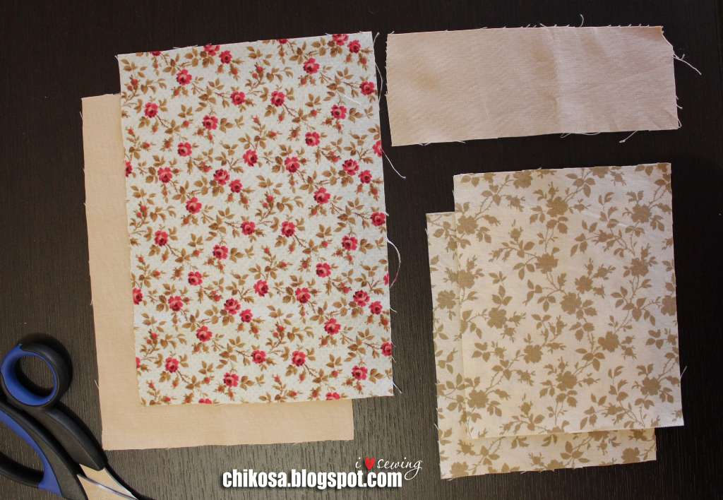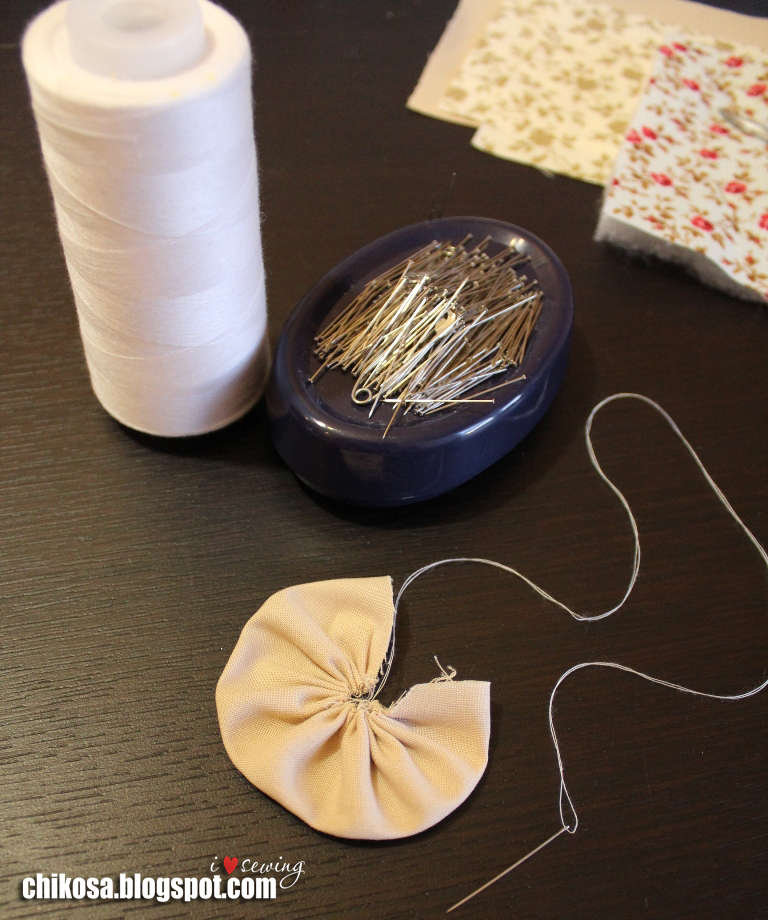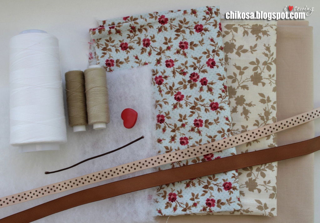 Нитки, пуговица, кусочек шляпной резинки для застежки, два вида ленточек, тонкий синтепон и три вида хлопков. Я брала американские хлопки.