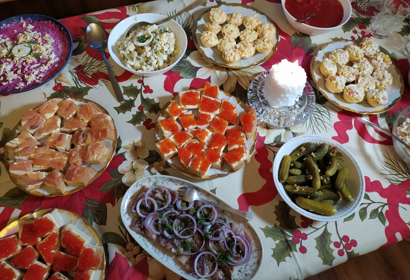 Приветствуются сырные и колбасные нарезки. Традиционные салаты - оливье, сельдь под шубой и прочие - также вполне уместны на праздничном столе.