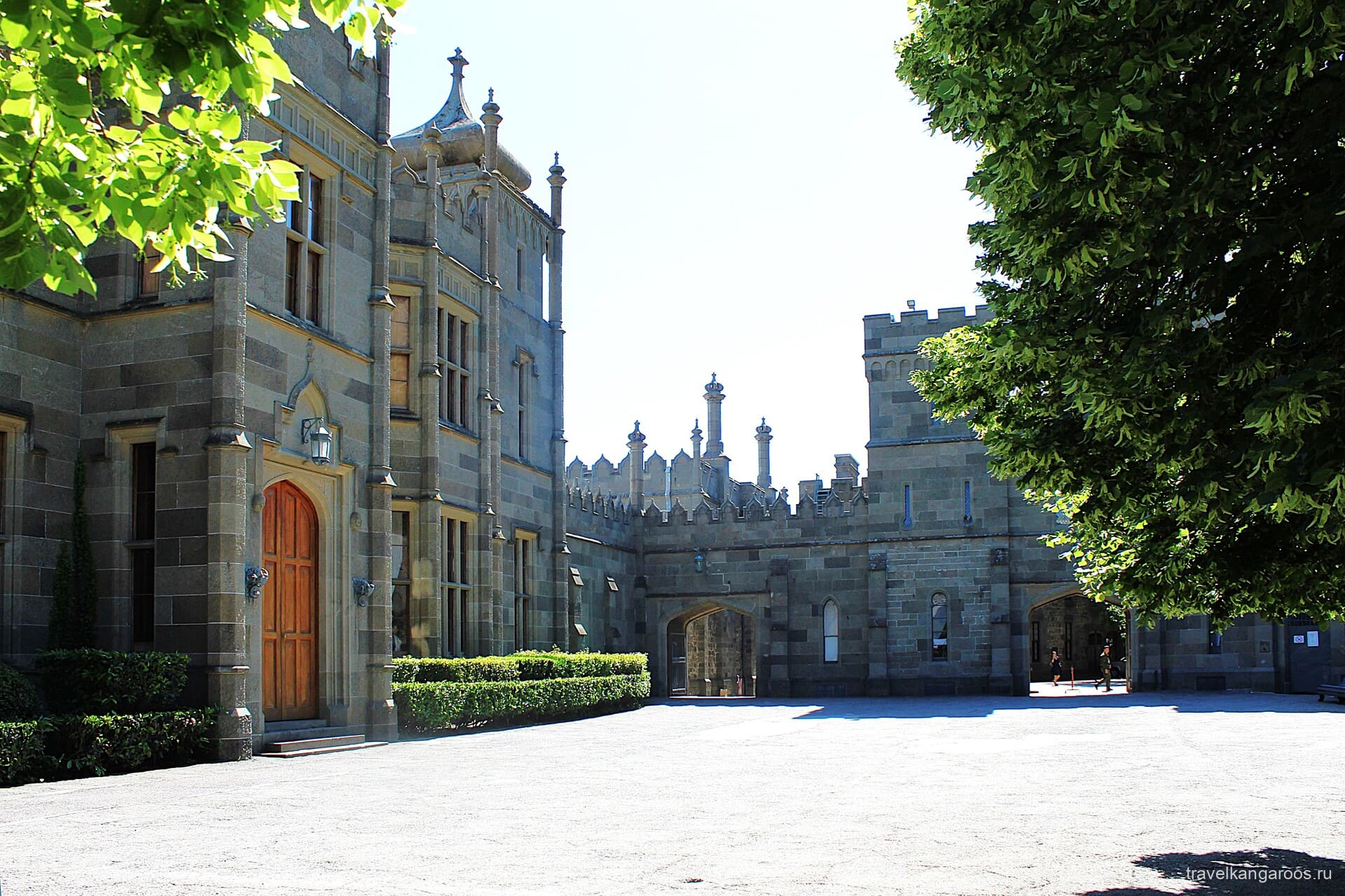 Прекрасное сооружение из диобаза (магматическая смесь лабрадора и авгита) создавался в сочетании английского и мавританского стилей по современным принципам, которые заключались в гармоничной привязке строения к местному ландшафту. И не просто привязке! Дворец как бы вторит очертаниям силуэта Ай-Петри.