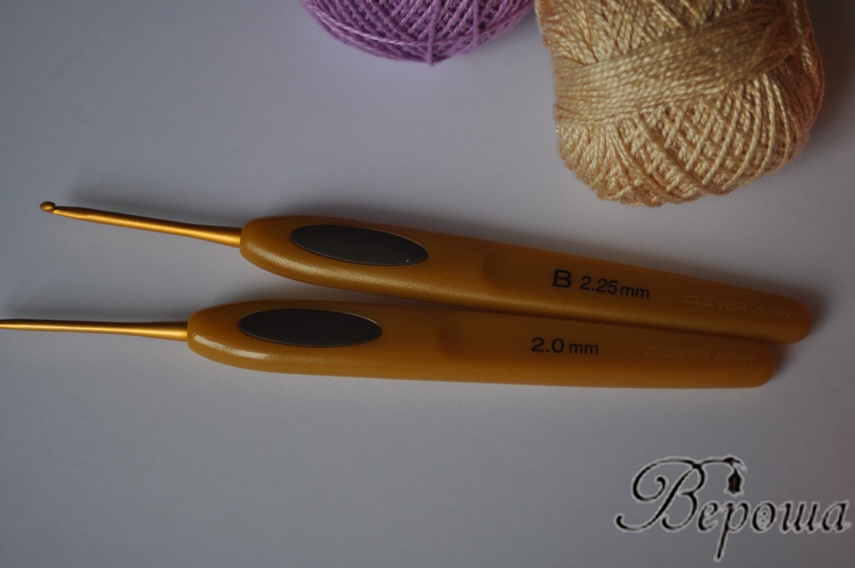 2. Крючок 2-2,25 мм. (у меня "clover" мне очень нравится ими вязать - приятные. Кстати, толщина крючка зависит от Вашей вязки: если Вы склонны вязать туго, то следует взять крючок бОльшего размера).