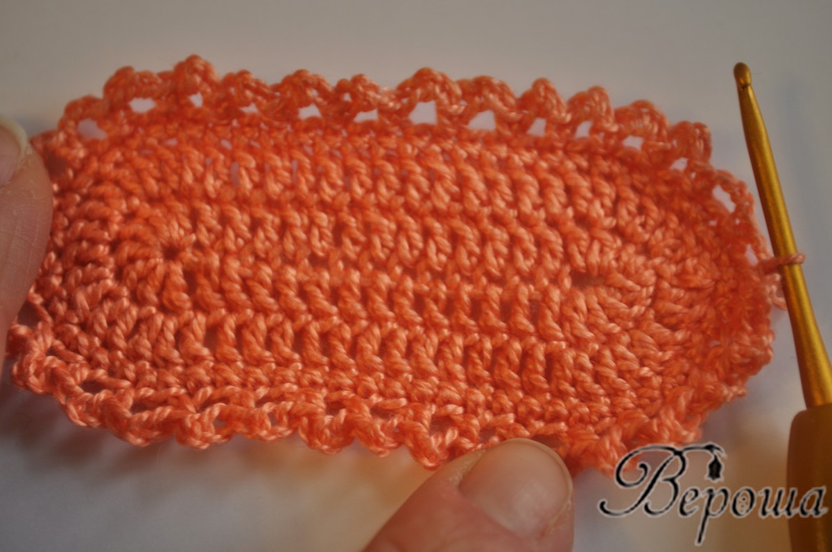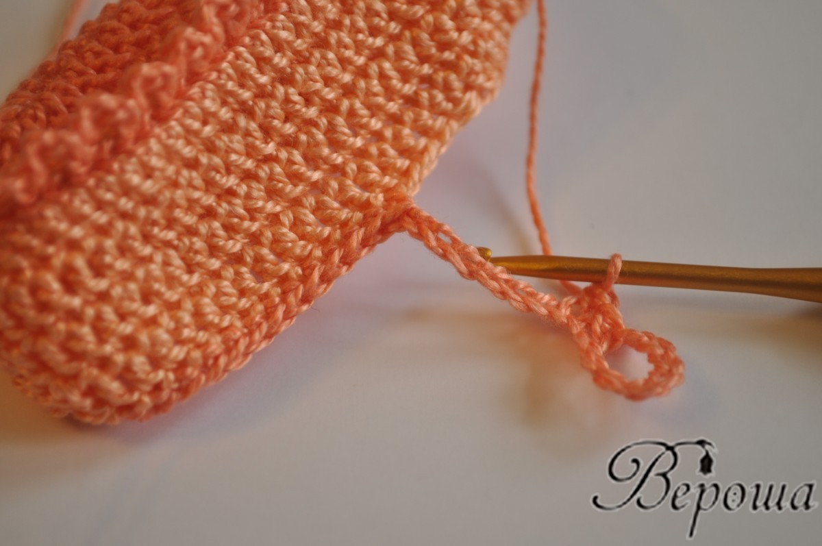 9-ый ряд. Обвязываем край ст.б/н. Если нам надо застежку на пуговицу с перепонкой, то вяжем от боковины (приблизительно 6-10 петель от середины переда) 16 возд. петель, потом начиная от 8-7-6-5-4-3-2-1 вяжем ст.б/н и далее продолжаем обвязывать верх туфельки.