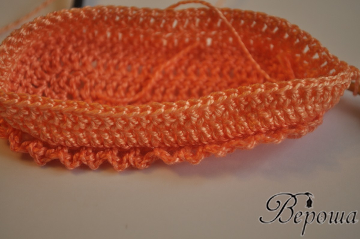 4-ый ряд: Вяжем за переднюю полупетлю! Повторяем: 3 возд.п, 1 ст.б/н - по кругу до соединения, причем ст.б/н провязываем не в каждую пеллю, а через одну.