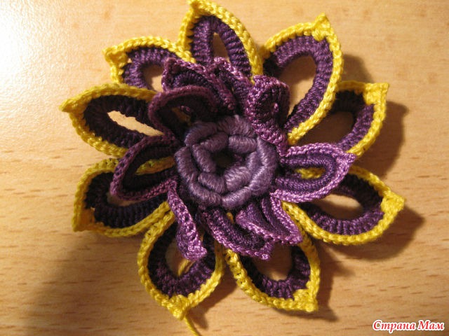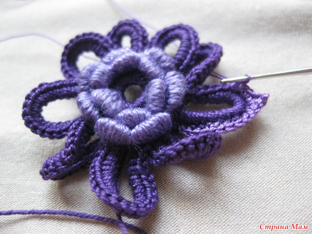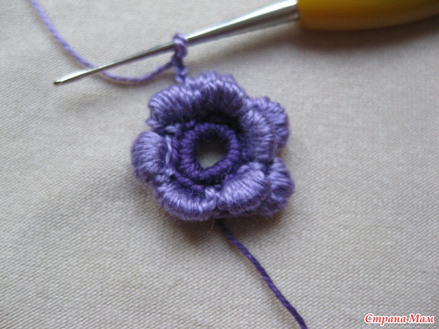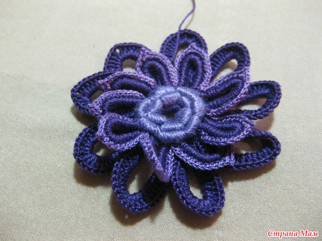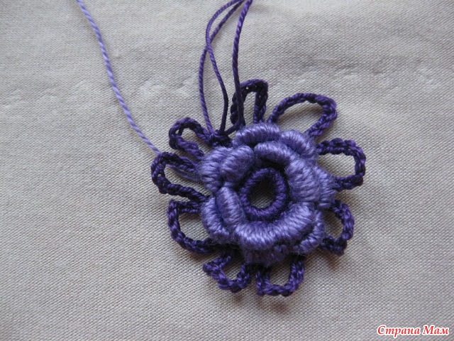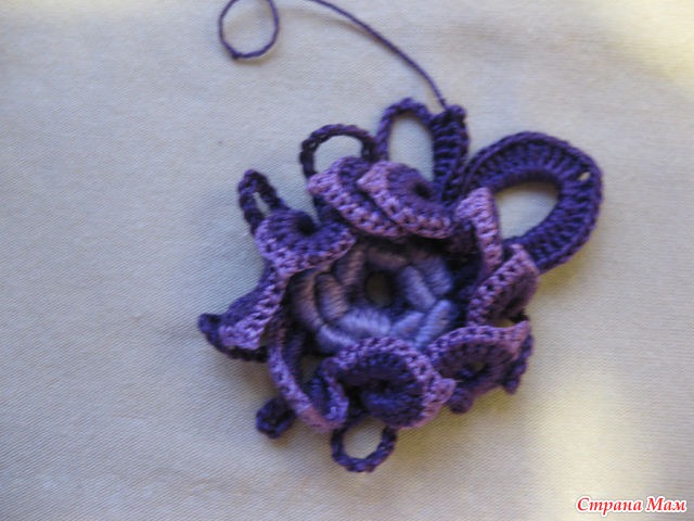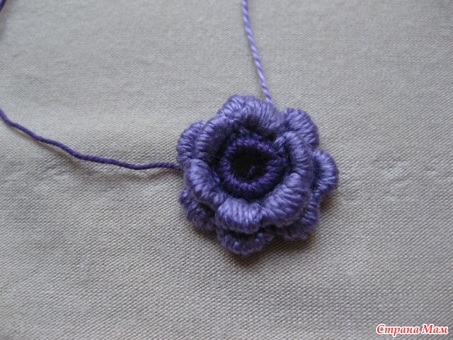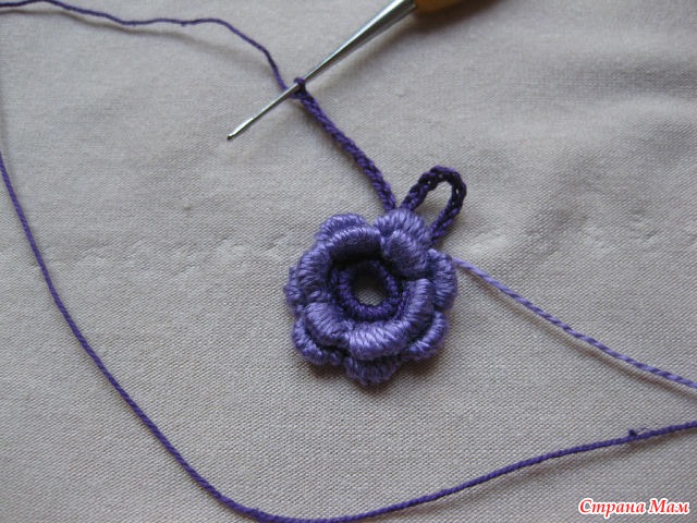 12)И так далее с изнанки вяжем четыре в. п. и прикрепляем к цветку, создавая тем самым платформу для следующего ряда.