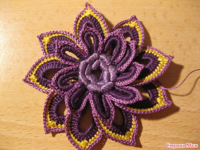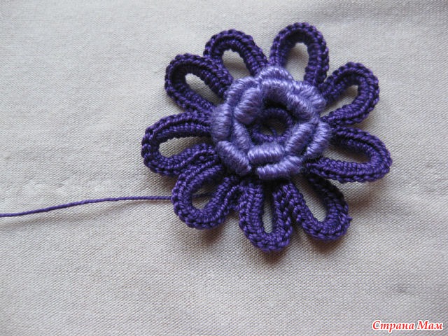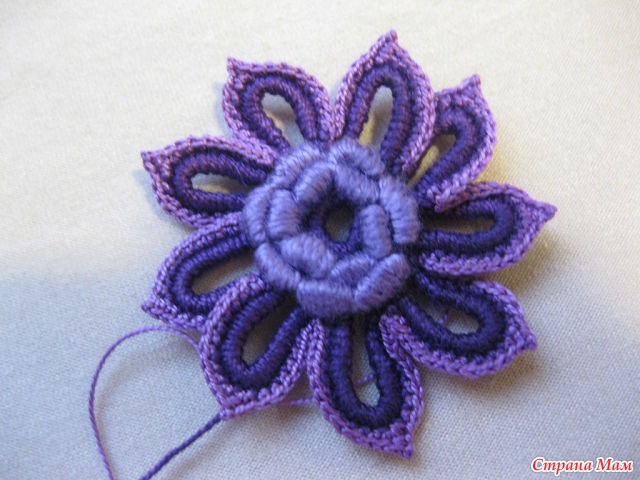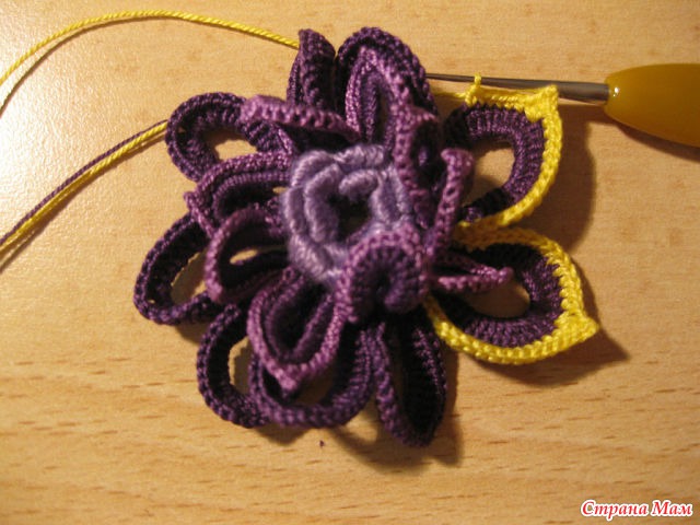 30)Нитью другого цвета мы обвязываем наши лепестки, тем же приемом, что и в первом ряду в середине обвязки лепестка мы делаем 2 в. п. для заострения лепесточка.