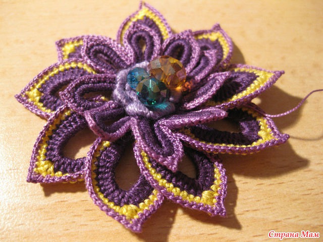 33)Вот так мы закончили вязать наш мотив. Серединка цветка оставлена такой некрасивой что бы вшить в неё бусики.