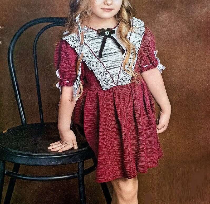 Для застежки связать планку из столбиков с/н (с одной стороны выполнить петельки для пуговиц из 3 возд. п.). По вставке пришить готовое кружево, немного присборив его, по центру горловины пришить бантик.