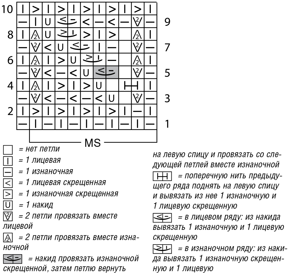 Число петель кратно 10 + 1 + 2 кромочные = вязать согл. схеме. На ней даны лицевые и изнаночные ряды. Начать с 1 кромочной, раппорт постоянно повторять, закончить петлей после раппорта и 1 кромочной. Выполнить 1 раз 1–10-й ряды, затем постоянно повторять 3–10-й ряды.