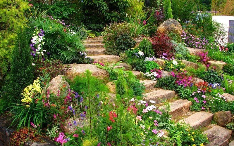 Террасированный склон — альпинарий данного типа организован на пологом склоне в виде небольших ступеней, поддерживаемых большими каменными глыбами.