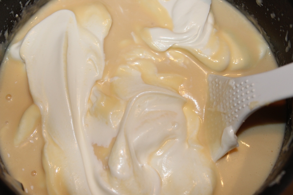 Аккуратно соединить сливки и крем и хорошо перемешать сверху вниз.