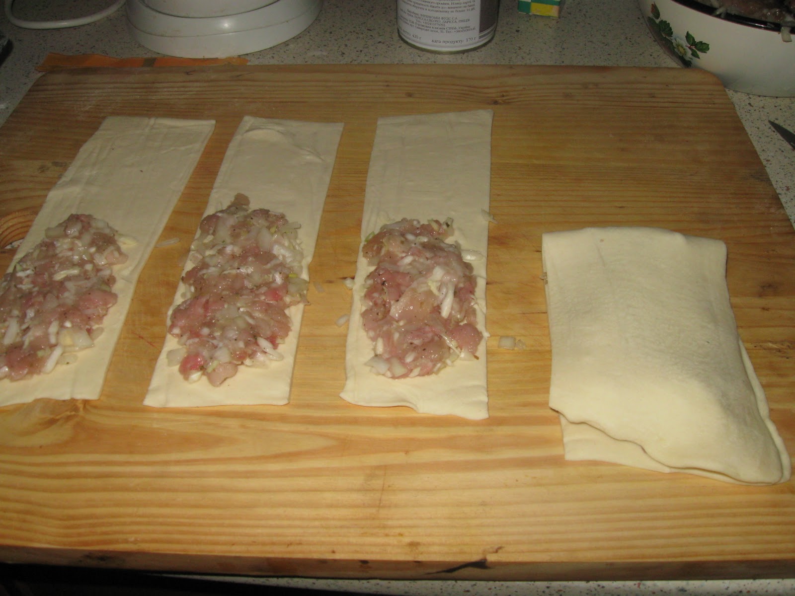 Слоеное тесто порезать полосками и на него уложить фарш. Свернуть и обжать со всех сторон.