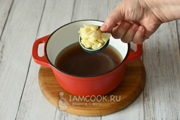 Далее добавьте нарубленный крупно чеснок. Его должно быть много. При варке острота чеснока уйдёт, останется только аромат.