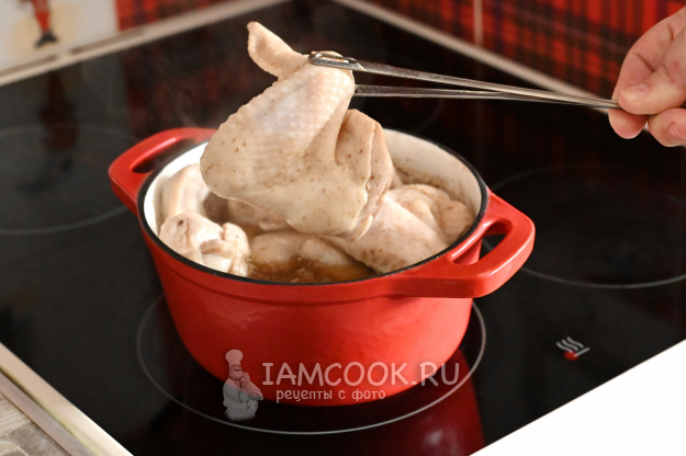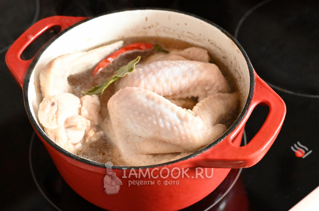 Как только жидкость закипит, опустите в неё куриные крылышки. Снова доведите всё до кипения и убавьте огонь до среднего.