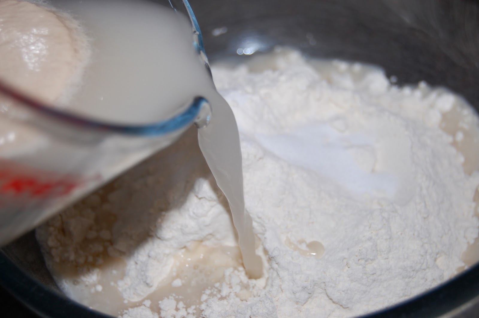 Тонкой стрункой влейте в муку воду с дрожжами. Делайте это медленно, помешивая смесь деревянной лопаткой, чтобы не было комочков.